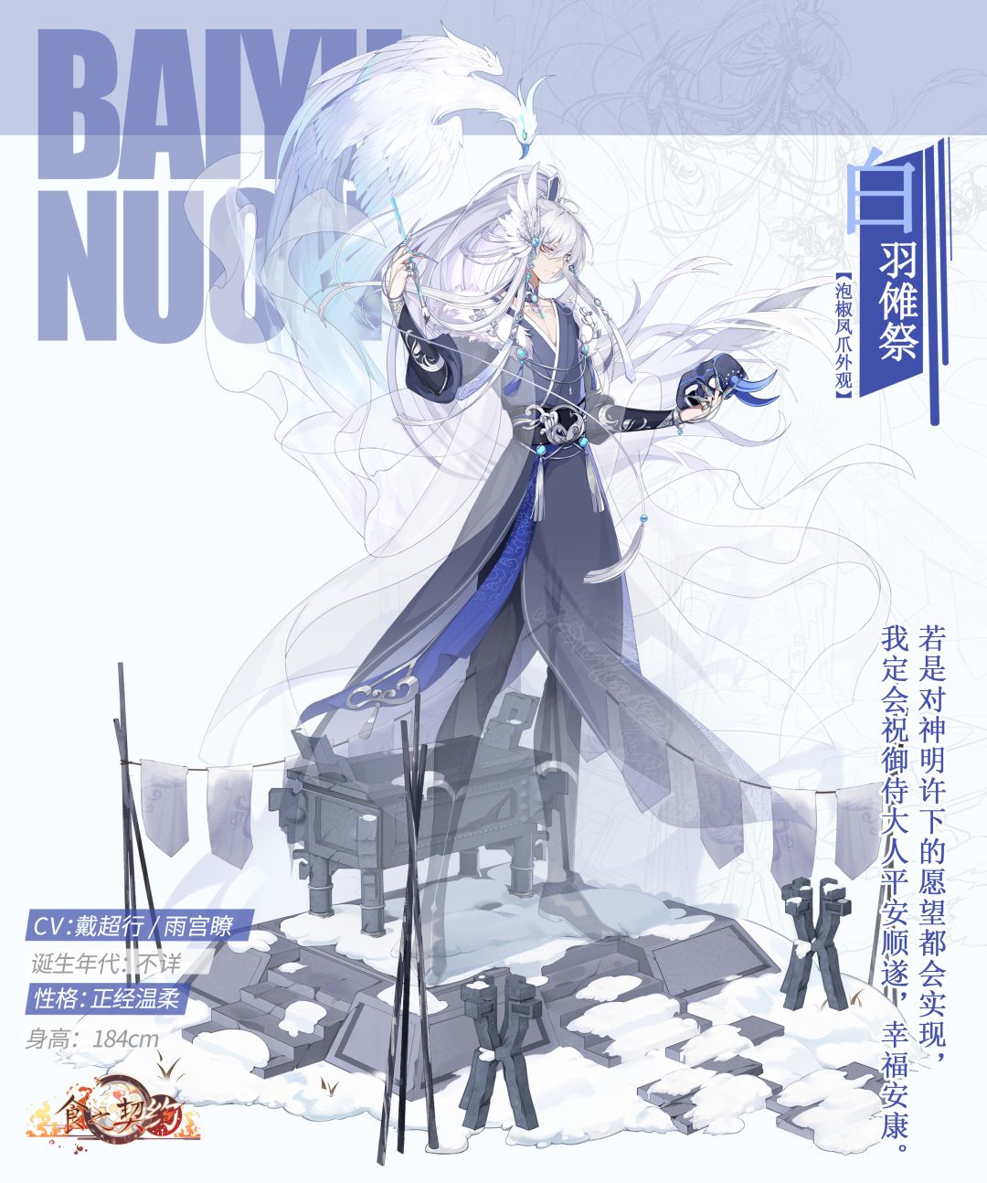 “若是对神明许下的愿望都会实现,我定会祝御侍大人平安顺遂,幸福安康。” 一、配音 中文:戴超行 日文:雨宫瞭 二、技能动作展示一览 —————————————— ☆感谢大家对《食之契约》的支持与陪伴,想了解更多资讯可前往官网( )查看! 【食之契约】官方资讯平台: ①官方微博: ②官方微信公众号:搜索“食之契约” ③官方B站: