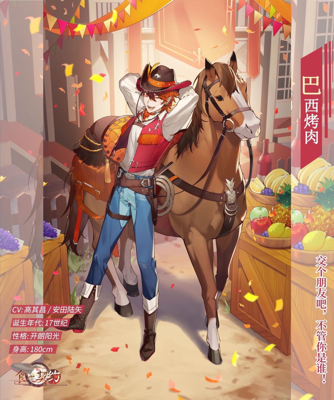 “交个朋友吧,不管你是谁!” 一、简介 巴西烤肉有烤牛肉、鸡肉、猪肉、香肠、奶酪、面包甚至菠萝、梨和苹果。巴西人注重保留食物的原味,对烤肉的用料极为吝啬,只放粗盐来满足人体对钠的基本需求,除此之外只保留肉的本来味道。它的做法粗犷又简单,只需要把所有原料腌味后分别串在一个长约一米带凹槽的扁平铁棍上,放在碳火上慢慢烧烤即可制成。 二、配音 中文:高其昌 日文:安田陆矢 三、技能动作展示一览 —————