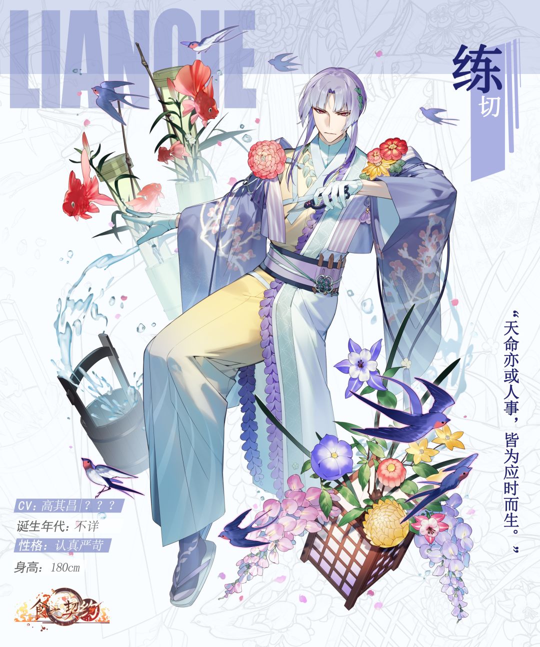 “天命亦或人事,皆为应时而生。” 一、简介 练切就是简单地用白豆沙馅加白玉粉做成外皮,改变其颜色形状做出最精致的造型的和菓子。练切会根据情况做成当季的花、水果或者是鸟的形状,有的细节之处甚至能感受到禅意,由于色彩丰富,造型优美,种类随季节变化,所以自古以来多被用于庆祝典礼或茶道,有点心艺术品之称。 二、配音 中文:高其昌 日文:敬请期待 三、技能动作展示一览 —————————————— ☆感谢大