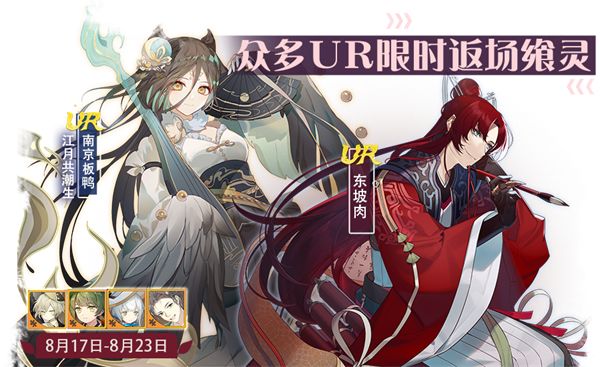 亲爱的御侍大人: 感谢大家对食契大陆的关心与喜爱,【八月第三周活动预告】来啦!快来看一看吧!❤ ★活动一 返场狂欢会第三十三期珍稀飨灵返场★ 活动时间:8月17日更新后~8月23日23:59 活动名称:返场狂欢会 活动描述:活动期间,返场狂欢会主题活动第三十三期全新上线。每日完成任务可领取抽奖道具,参与抽奖即有机会获取复刻UR飨灵-东坡肉、UR南京板鸭复刻外观-江月共潮生和众多UR限时返场飨灵,更