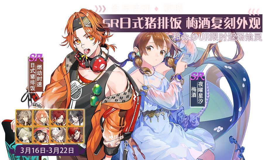亲爱的御侍大人: 感谢大家对食契大陆的关心与喜爱,【三月第三周活动预告】来啦!快来看一看吧!❤ ★活动一 返场狂欢会第二十八期珍稀飨灵返场★ 活动时间:3月16日更新后~3月22日23:59 活动名称:返场狂欢会 活动描述:活动期间,返场狂欢会主题活动第二十八期全新上线。每日完成任务可领取抽奖道具,参与抽奖即有机会获取SR日式猪排饭复刻外观-燃动时速、SR梅酒复刻外观-夜曜星汐和众多UR限时返场飨