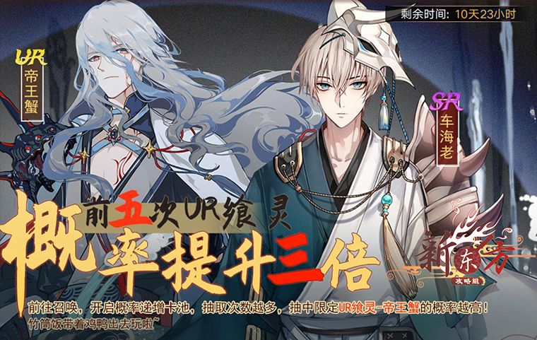 下篇会详细讲副本及消耗,晚上会出~ —————————————————— 「第一部分:卡池类」 —————————————————— 【饕餮盛宴】概率递增卡池(帝王蟹) 时间:4.30-5.10(11天) 消耗:大蒜、钻石、氪金礼包 限定飨灵:Ur-帝王蟹/威士忌/年糕汤、Sr-车海老/狮子头/普雷结 ※抽卡消耗 大蒜=150/抽,限购50抽,总计7500大蒜 钻石=100/抽,限购50抽 签到