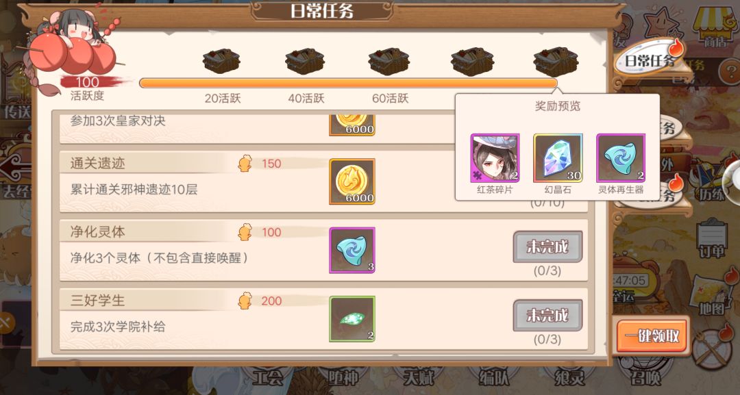 1、探索的体力瓶和香料尽量都完成 体力瓶比体力好存(做空运不用体力刷或刷不完的叉出去) 遇到体力活动时体力瓶子会是你刷奖励的保障 香料推荐刷中级的 给的低级香料多(做空运) 中级自己升菜时用或者卖了也行(金币一般不会缺到这种程度-_-|| 卖的金币很少) 2、这个遗迹记得打 后面两个东西:灵体(刷词条)和复制体(强化)很缺 并且新手只需要用你最强的阵容打一次(15关以上 越多越好)遗迹自带扫荡 但