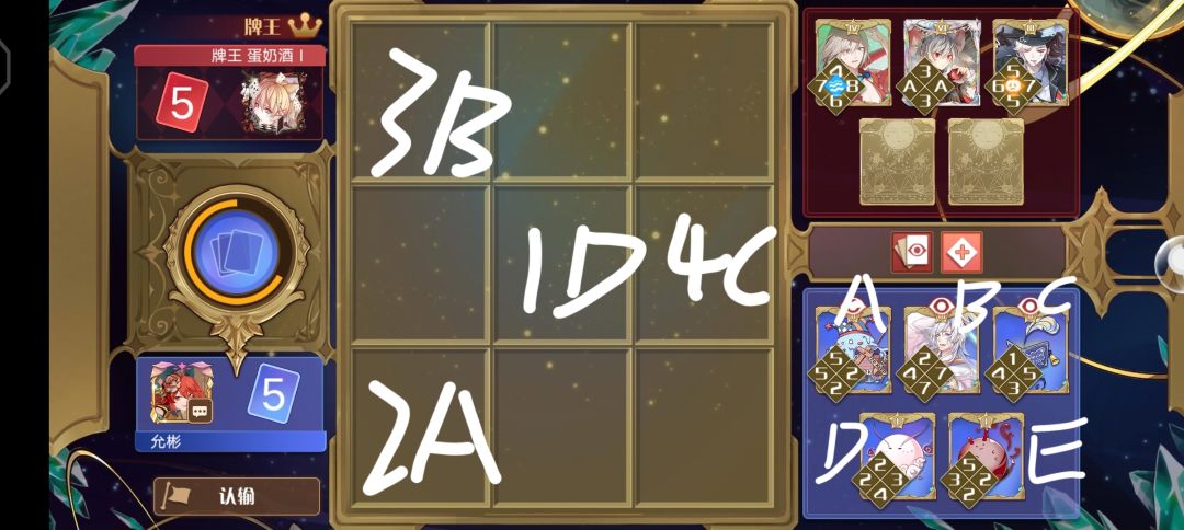 9宫阁对应如图,卡牌对应如图。接下来所有的牌都是这个顺序。 战牌有三种:牌手、牌王、幻牌王。 从来没有玩过的跟着我打几轮无脑打法就行了。