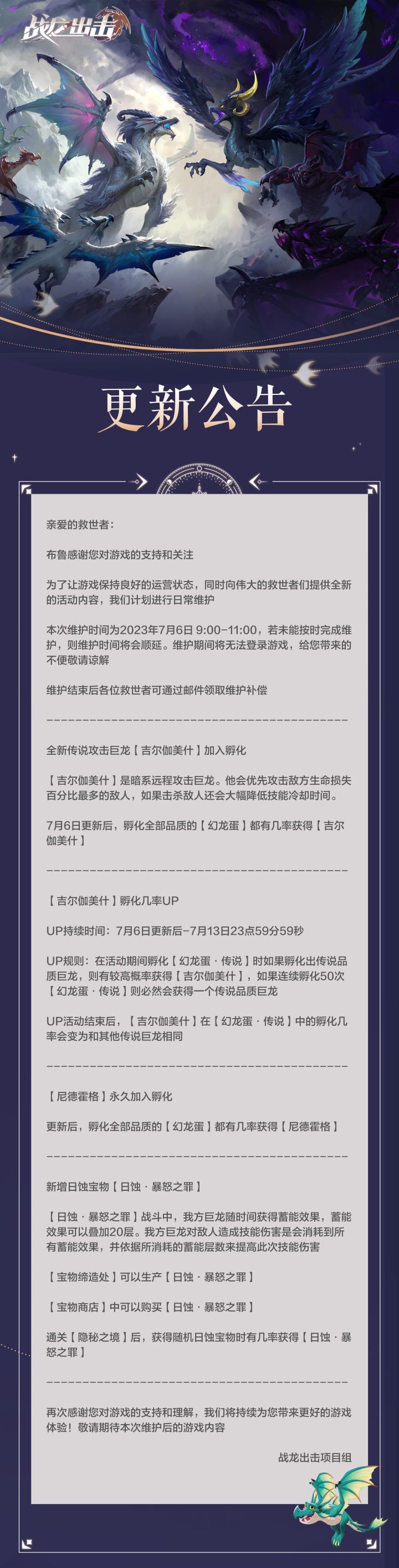 尊敬的《战龙出击》玩家:感谢您一直以来给予《战龙出击》游戏的支持与厚爱!由于游戏开发运营策略的调整,《战龙出击》游戏将于2023年10月31日10时停止运营,现将终止运营相关事项通知如下:2023年8月31日10时(注1):关闭全平台下载入口,玩家将无法下载本游戏,同时停止游戏充值、新用户注册;2023年10月31日10时:正式停止游戏运营,关闭游戏服务器(注2),同时关闭《战龙出击》游戏官
