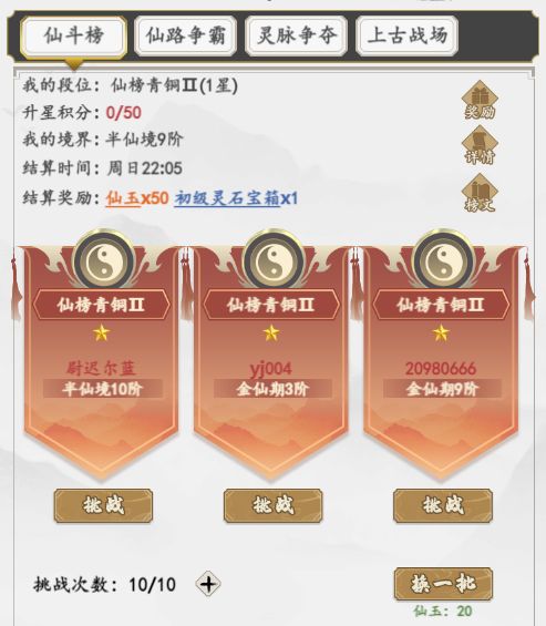 城镇内的玩法以PVP为主,是仙友们各显神通进行比试切磋一较高下的场所。玩法丰富多样有:本服的段位排名赛、跨服争霸赛、大陆据点争夺、阵营挑战赛。活动奖励也是非常的丰厚,海量的仙玉、仙魂、灵石等奖励。本文会为诸位仙友逐一介绍城镇pvp玩法。1、仙斗榜:(主角达到炼虚期1阶开启)(1)每次挑战都可获得积分和道具奖励,如果失败,则只能拿到一半的道具奖励。(2)随着段位的提升,每次挑战可以获得的道具奖