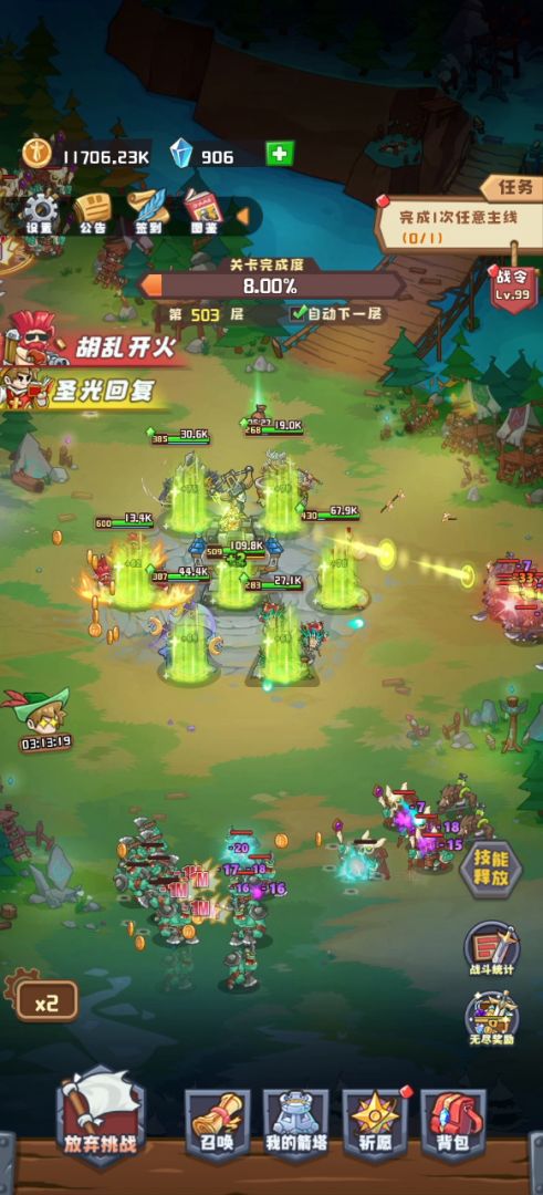 后面的关卡一关十几分钟到半小时,手机又发烫的严重… 前面关卡主养加特林,加特林活下来就过关了。 后面关卡基本上要把塔全保住,避免暴毙。 加特林主要输出,其他全辅助了,装备就差不多这样了。 目前加特林开大伤害最高1M,一百万。 刚才有个大佬给了个准确的倍率数值。 伤害计算公式:基础攻击力×圣物属性攻击加 成之和×技能攻击加成之和。其中号角技能,石中剑技能,力量晶粹技能都是相加关系。同圣物的伤害叠加,