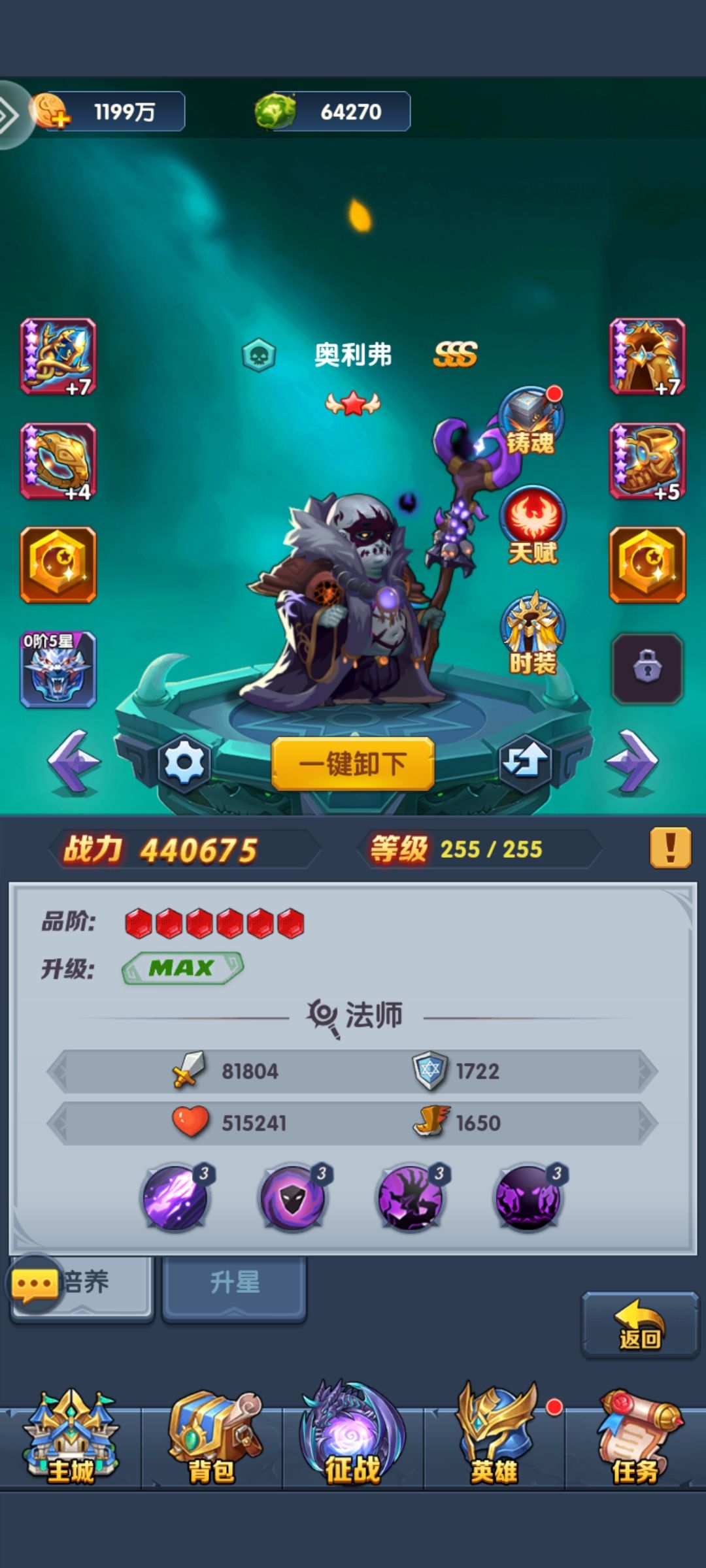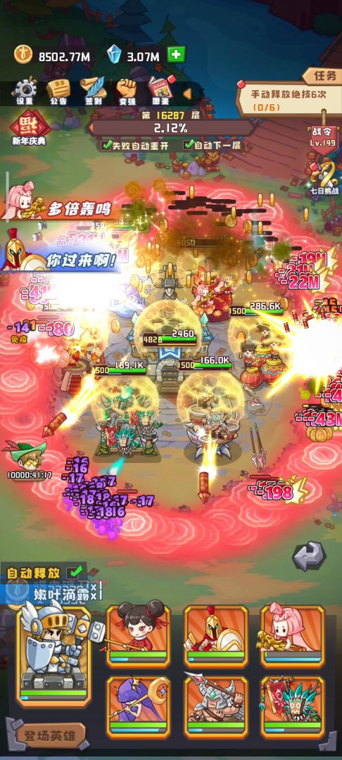 玩了两天过了6-2,说一个比较简单的阵容 第一天广告全看,兑换码全换,抽到主c狂风,随后抽到5辅助(虚弱,斯巴达,新月,祭祀,号角)就替换 金币全升狂风带灵魂收集器和电池快速刷大招,新月带星星和电池快速回大招,其他辅助全带魔法书加法术攻击,绿色魔法书也可以用上 成型后狂风就能刷金币第五层了,直接把狂风刷到最高级,配法术道具,开双倍一直刷无尽,先刷一天把圣物升满 第二天再把万能碎片升剑神升到五阶,主