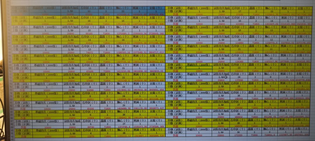 剑仙圣物搭配,词条分配与伤害对比 ps:黑洞系数=0.7 太阳系数=0.6 日月同辉系数=(1+0.6*生命比例)*(1+0.6*(1-生命比例)) 剑仙本身圣物搭配: 3史莱姆配1灵魂收集增加回蓝速度和普攻覆盖面积,暂时固定不变。 剩余4个圣物搭配交换对比后,统计得出3种方案: 一、2黑洞2太阳可以伤害最大化,但是打boss随血量降低伤害递减。 二、4黑洞伤害最为稳定。 三、2黑洞1太阳1月亮伤害比4黑洞略高,并且怪物血量一半时伤害最高。 辅助圣物搭配:(我是4辅助2物C,共32个辅助格子) 统计可以看出来暴伤与攻击光环对半分,上下浮动2-3个时伤害最高,且伤害浮动很小。 ps:基础攻击和攻击、爆伤词条加成比例与辅助圣物搭配数量无关,嗯,对的,你们没想错,我这个也统计过了。 词条搭配: 首先,不要攻速!不要攻速!不要攻速!重要的话说三遍!(空a率太高,攻速越高,空a率越高,收益贼低) 射程加到22以上。(27大概全图) 物爆100%左右,最好不到低过95%,也不要高过110%。 攻击和爆伤优先攻击(攻击光环加成受到攻击词条影响,爆伤光环加成为固定值)