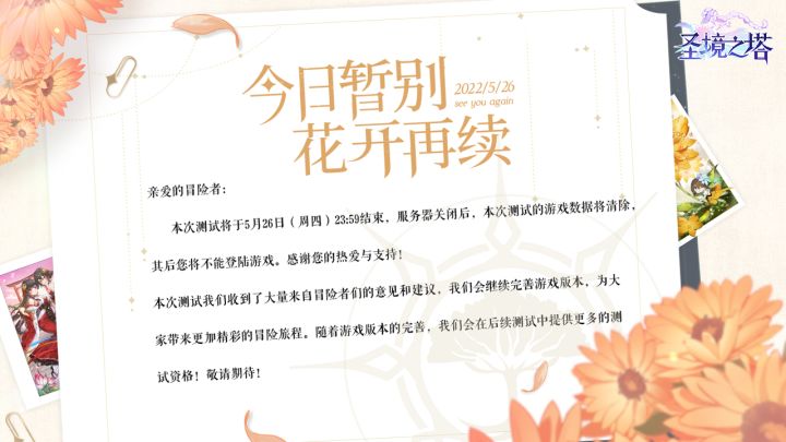 亲爱的冒险者:本次测试将于5月26日(周四)23:59结束,服务器关闭后,本次测试的游戏数据将清除,其后您将无法登陆游戏。感谢您的热爱与支持!本次测试我们收到了大量来自冒险者们的意见和建议,我们会继续完善游戏版本,为大家带来更加精彩的冒险旅程。随着游戏版本的完善,我们会在后续测试中提供更多的测试资格!敬请期待!