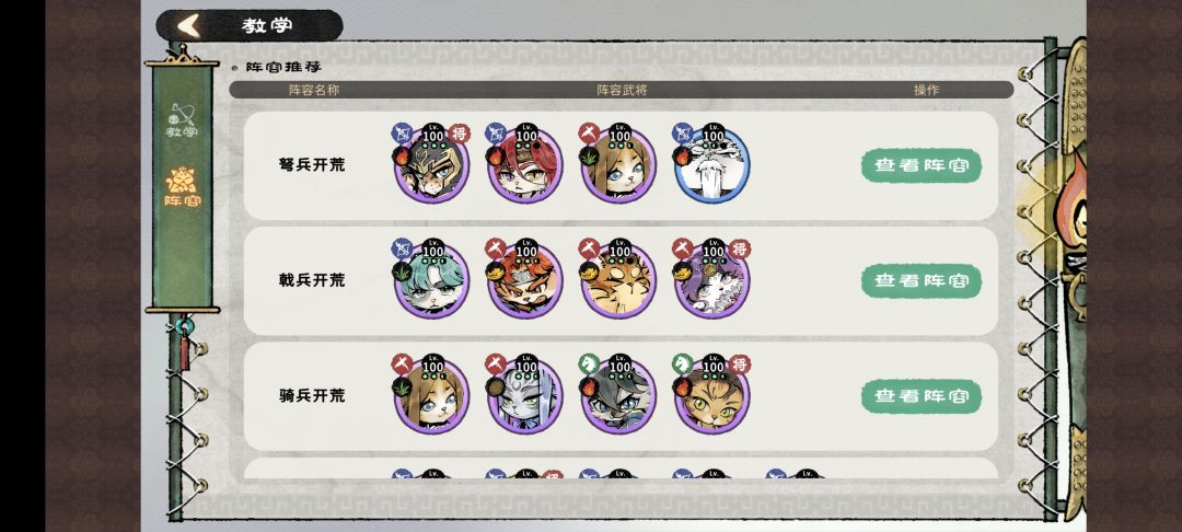 之前已经介绍了基础武将的选择和养成,本文的切入有点特殊,不是从兵种、大将或者特定的某些武将入手,而是以阵值的搭配为入手~ 阵值搭配——10以内的加法 阵值共分为1.0、1.5、2.0、2.5、3.0。一支队伍需要4~5只猫,所有猫的阵值相加不超过10,队伍就出来了。 初期过度队伍建议搭配 1. 4*2.5——过渡队伍 * 首先4猫队可节省第五只猫的养成材料,2.5的猫身板素质高,所以初期推荐4*2