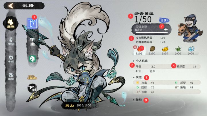 在了解猫话列国的游戏界面和玩法之后,猫叔为大家带来了最重要的部分之一【武将系统】。目前游戏已上线超过60个武将,你可以通过【召唤】或活动获取他们。点击武将进入武将详情界面查看武将信息。1.稀有度:表示该武将的珍惜程度。2.阵值:即设置出征武将所需的阵值,组成队伍时,要将阵值控制在10以内。3.擅长属性:擅长 属性等级上升后,其他属性也会变得可以修炼。4.熟练度:每次使用武将,就会增加1