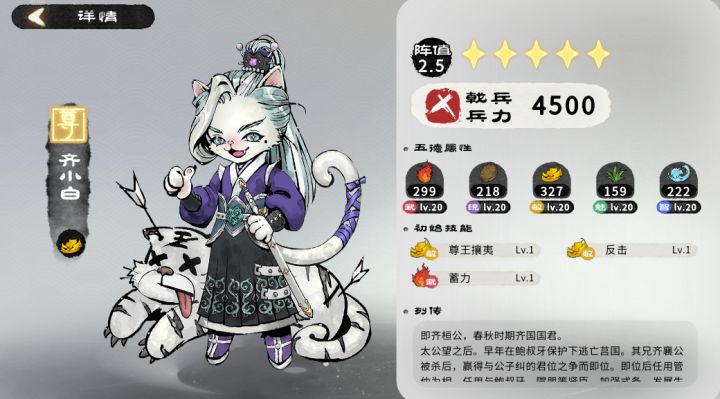 之前已经介绍了基础武将的选择和养成,本文的切入有点特殊,不是从兵种、大将或者特定的某些武将入手,而是以阵值的搭配为入手~阵值搭配——10以内的加法阵值共分为1.0、1.5、2.0、2.5、3.0。一支队伍需要4~5只猫,所有猫的阵值相加不超过10,队伍就出来了。初期过度队伍建议搭配1. 4*2.5——过渡队伍* 首先4猫队可节省第五只猫的养成材料,2.5的猫身板素质高,所以初期推荐4*2