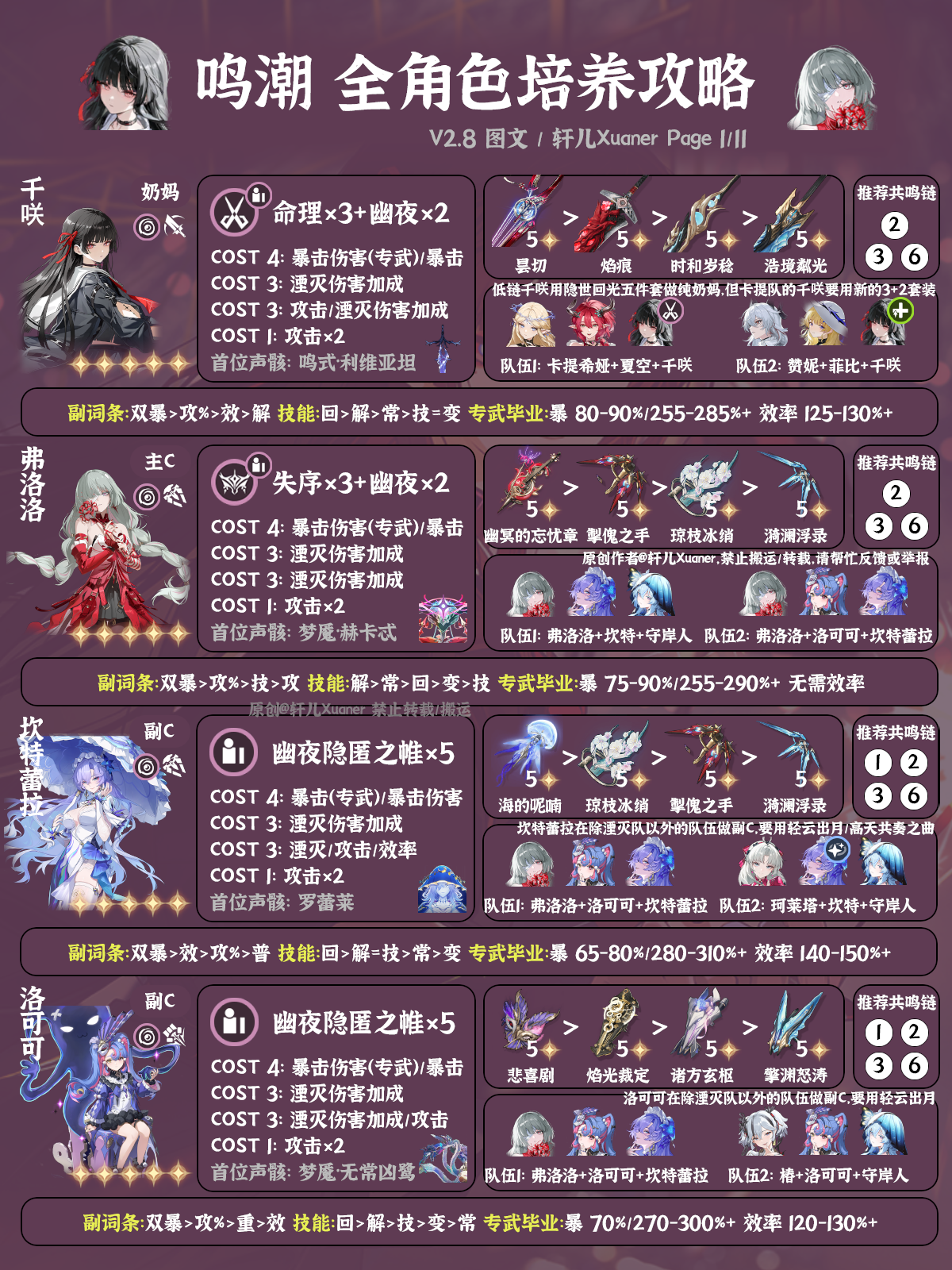 哦呀!这里是Moealkyne! 本期为大家带来的是【鸣潮】V2.2限定角色坎特蕾拉的养成攻略~ 【此角色一图流适用2.2正式服!相关数据已经过游戏内查询~】 【正式服UID:100532881】 本篇攻略将会按照培养素材需求、技能优先级推荐、武器推荐、声骸推荐、共鸣链分析、配队建议等多个方面,详细剖析该角色的方方面面! 「模板更新」 从2.0版本开始,我们将采用全新的模板制作角色一图流