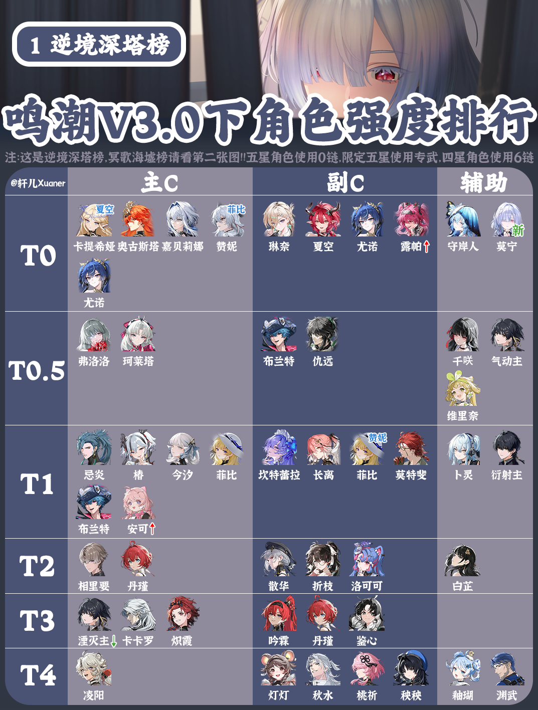 🎮《鸣潮》1.1版本已正式上线,目前游戏中的角色强度如何呢?为大家带来最新的强度榜一图流,个人观点,欢迎大神们一起探讨交流! ✨T0梯队:共3位 今汐:版本之子,超高爆发,可做主C。 忌炎:开服至今霸榜的主C,不过目前大家都想拿今汐,毕竟妹子谁不喜欢呢? 维里奈:版本最强奶妈,既能回血又能增伤。 ✨T1梯队:共5位 吟霖原本是心中的T0,这次将她放在了T1,原因是今汐的上线,和今汐搭配的话,