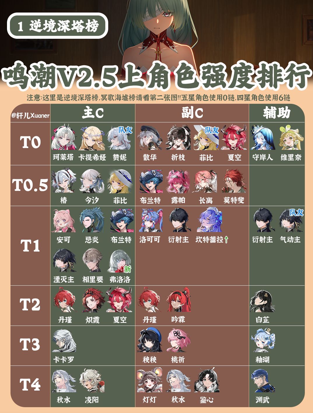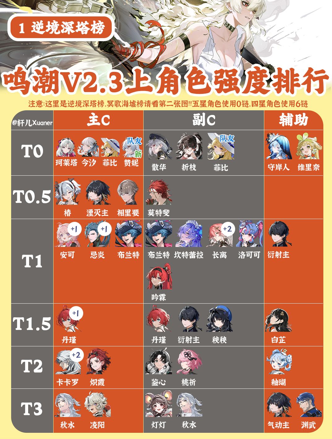 大家假期快乐,我是轩儿Xuaner,鸣潮V2.3上半最新全角色排行榜出炉~ (注:图一为逆境深塔榜,图二为冥歌海墟榜) 本次更新内容: 1、新角色赞妮逆境深塔榜T0,冥歌海墟榜暂排T0.5 2、增加【队友】标签,意思是当前角色定位需要强绑定另一位角色才能发挥当前强度,否则强度会下降,当前版本赞妮主C与菲比副C强绑定,一起配队会很强 3、对于有多种角色定位的共鸣者,分开讨论强度,比如菲比、布兰特、光