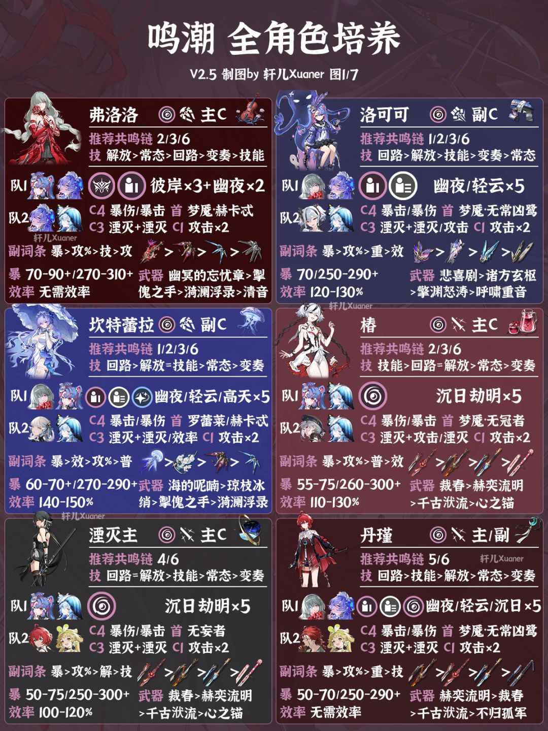 本片图文给各位漂泊者带来鸣潮V2.5共计37名角色培养一图流~ --------------------------------- 攻略食用指南 ① 模板更新,更加精简,一目了然,并且较之前更新了可选声骸套装数量 ② 先后顺序没有任何含义,会将新角色排在前面,并且同属性角色会放在一起 ③ 毕业面板仅列出关键属性,属于参考范围,双暴上限值不一定可以同时满足,请以自己使用武器和声骸为主判断 ④ 更多详