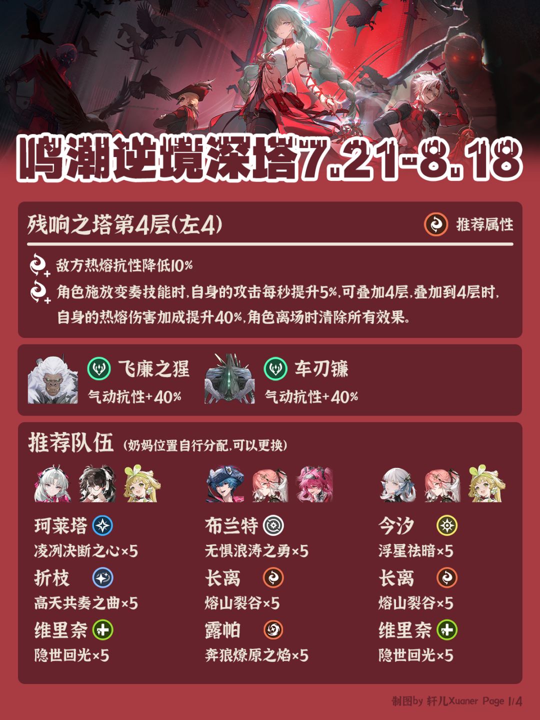 晚上好呀,漂泊者们~咱们鸣潮深塔更新啦,记得给弗洛洛准备好这700星声!轩儿Xuaner今天给各位漂泊着带来7.21-8.18这一期逆境深塔的推荐阵容 ------------------------------- ① 残响之塔第四层(左4):该层敌人热熔抗性降低且有热熔伤害加成,变奏叠攻击,非常适合热熔速切队,主流推荐布兰特长离露帕这一队。当然龙凤队可用~ ② 回音之塔第四层(右4):该层敌人气