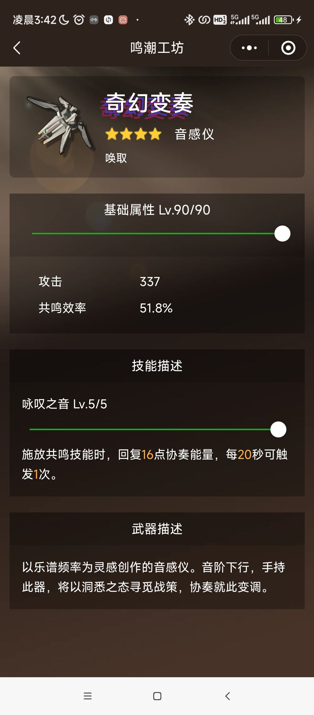 鸣潮的四星武器强度一直以来被诟病,但有那么一把武器却恨不得拆开来用,没错它就是四星专武奇幻变奏,首先有没有它的维里奈简直是两个人。为什么你至今没有打通深渊,那很有可能是奶妈没有练好,而落差即在于奇幻变奏。 由于该武器仅在1.0鸡眼卡池中UP过,你可能并不知道它有多好用,很多小伙伴至今甚至都没有一把。 第一,51.8%充能效率多香就不说了,充能套轻松达到250%充能效率。也不要小看这20秒一次的协奏
