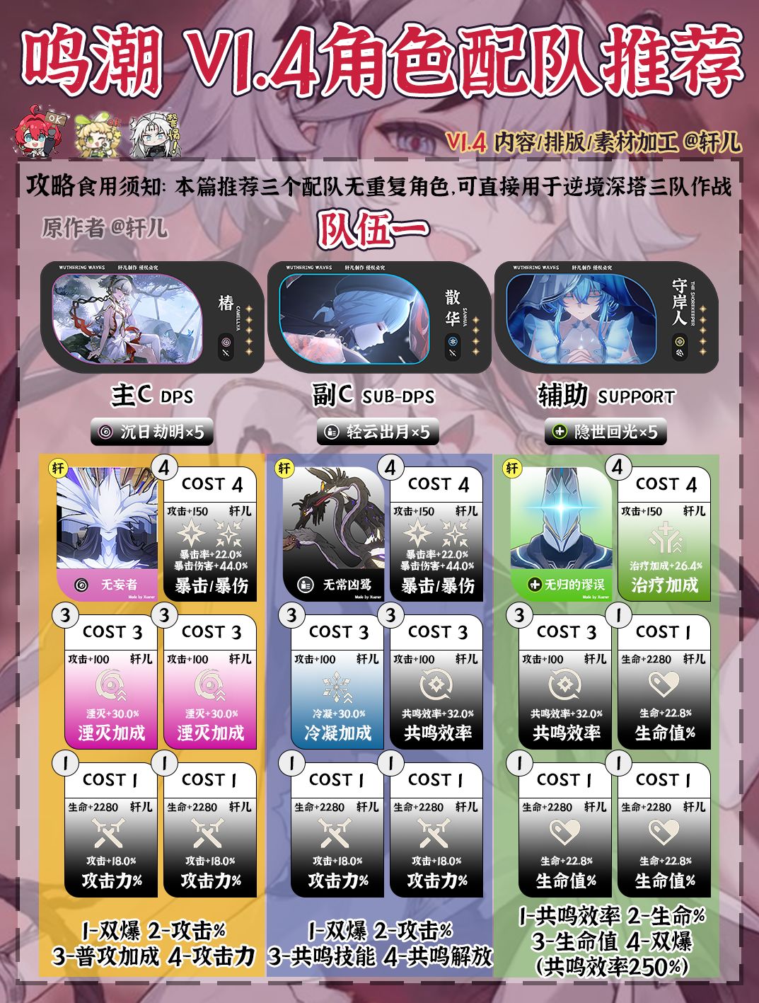 本人因为被过时以及恰流量的攻略误导导致浪费很多资源,所以翻遍各站到处偷学总结出了这篇攻略如果有用点个赞呗[表情_微笑][表情_微笑] 1忌炎 声骸 :43311 4暴击 3气动 1攻击 副词条 :双暴>百分比攻击>重击>固定攻击>其他 技能加点 :共鸣解放>共鸣回路>共鸣技能 武器 :专武>满纹秋 >常驻>纹秋>东落 配队 :莫特斐>秋水>散华(快速启动) 2暗主 声骸 :43311#鸣潮