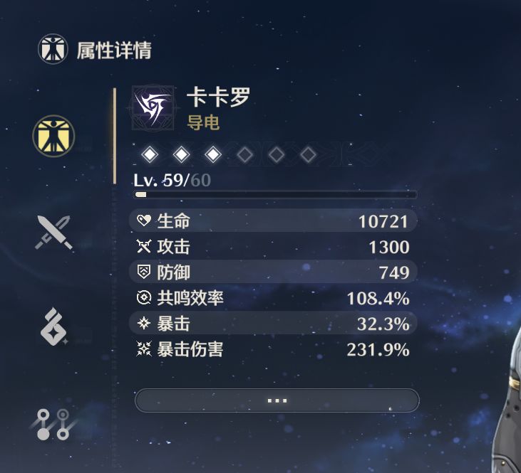 武器:有啥用啥,本人用的是四星 冬落(副词条攻击百分比) ,愿意氪大月卡的可以到时候选 纹秋(副词条暴击率)。忌炎专武给的重击伤害不是很契合卡卡罗,卡卡罗重击伤害的占比不高,常驻五星效果比较契合但是副词条是攻击百分比,可以酌情抽。 技能加点 :大招≥技能>回路=普攻(个人感受) 声骸:43311比44111均可 首先4c用 云闪之鳞 或 朔雷之鳞 二者均为雷套 主词条爆率≥爆伤>攻击百分比(过渡)