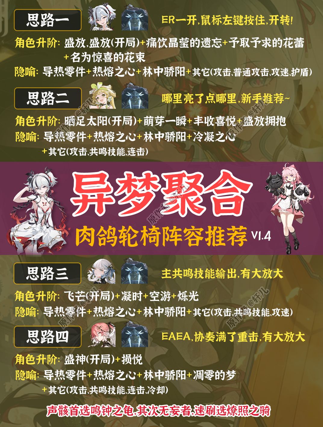 1.4版本鸣潮开放了新版肉鸽模式,而且新增了周常奖励12次,每次都可以领取声骸、培养材料、采集物等内容,非常利于没时间锄大地刷材料的漂泊者们~ 今天是本周最后一天,不要忘记把12次奖励领取次数用了哦,这里也推荐四套轮椅速刷阵容,有椿无脑上,进去开转省心,无椿新手选维里奈带乌龟,容错很高~ 隐喻遇到导热零件、热熔之心、林中骄阳无脑拿,林中骄阳yyds,其它隐喻根据所选角色输出手法来选~ 声骸首选鸣钟