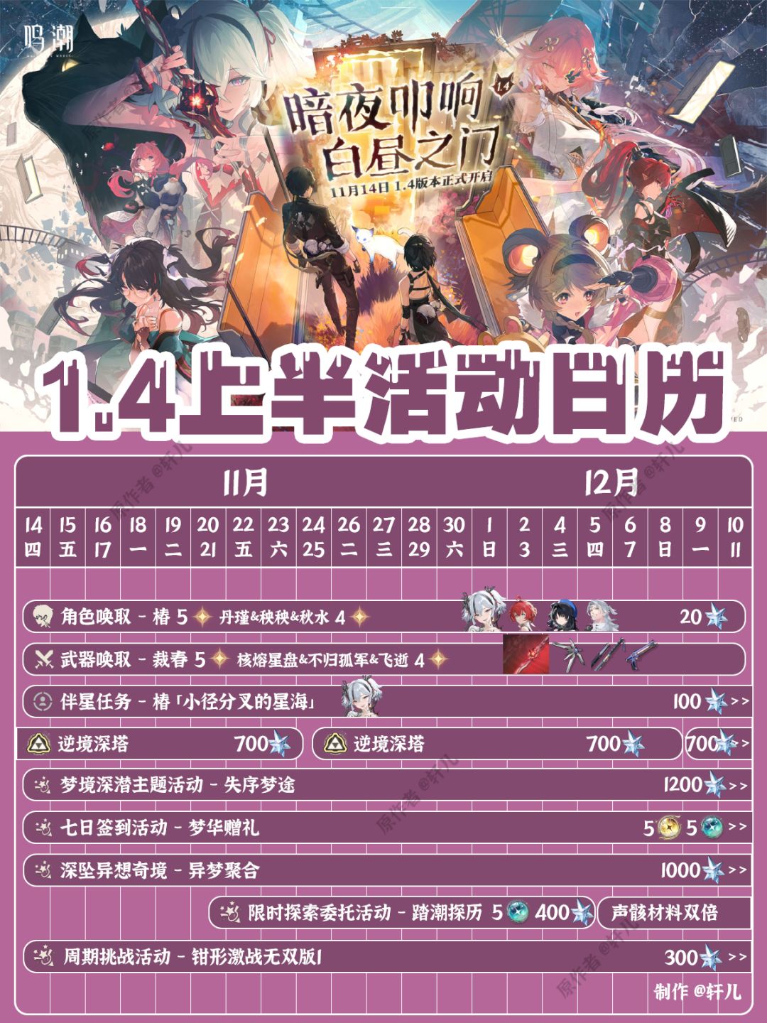 轩儿今天给大家整理了鸣潮1.4上半的活动日历和星声统计 零氪深塔打满的话最多可拿6800星声+5限定+10常驻,如果之前有攒星声的话拿下椿+专武应该不成问题 1.4版本还有三天上线,如果要养椿的话可以参照之前轩儿攻略准备一下材料哦~抽到直接拉满 1.4上半活动主要包括:椿伴星任务、梦境深潜主题活动 - 失序梦途、七日签到活动 - 梦华赠礼、深坠异想奇境 - 异梦聚合、限时探索委托活动 - 踏潮探历