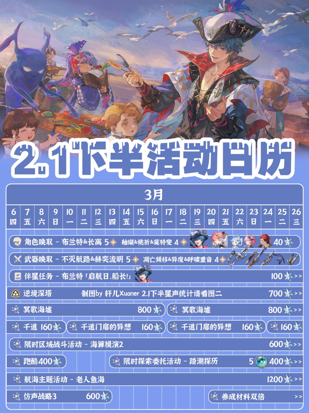本篇攻略内容为大家总结鸣潮2.1版本下半活动和可获得的星声~ 2.1下半卡池五星角色:布兰特&长离,四星角色:釉瑚&桃祈&莫特斐 2.1下半武器池五星:不灭航路&赫奕流明,四星武器:凋亡频移&异度&呼啸重音 冥歌海墟1期+千道门扉3期两个周常玩法共计1280星声,大家记得打! 上一期的逆境深塔也要记得打啊! 2.13-3.26:航海主题活动 - 老人鱼海 2.20-3.10:限时联机跑酷活动
