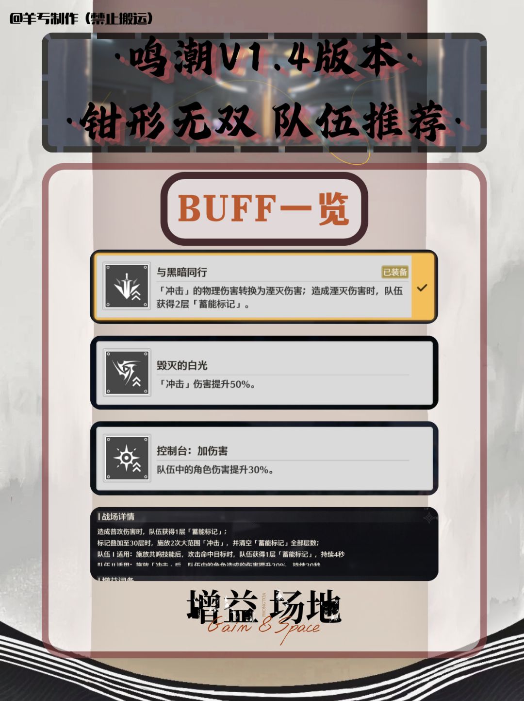 各位指挥官,开拓者,旅行者,漂泊者,绳匠,组长,舰长,导演们,大家好啊。我是小编,羊亐。 图中配队是:主C+副C+奶妈的搭配,大家根据自己的角色情况自行搭配! 制作者:羊亐(不是洋芋) 制作不易,禁止搬运。 大家喜欢的话,可以关注小编! #游戏攻略 #鸣潮 #鸣潮创作激励 #鸣潮攻略 #游戏资讯 #游戏讨论 #鸣潮椿