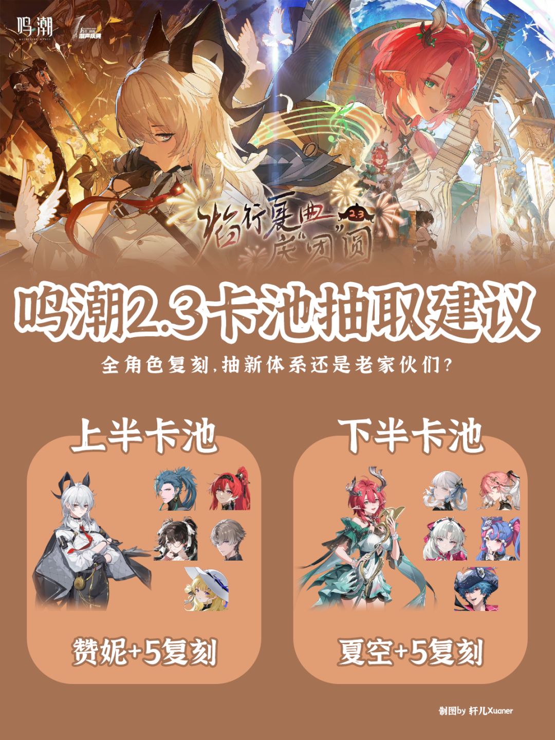 鸣潮2.3版本即将上线,轩儿Xuaner给各位老玩家或新玩家一些抽卡建议,仅供参考~ 上半卡池:赞妮+忌炎+吟霖+折枝+相里要+菲比 下半卡池:夏空+今汐+长离+珂莱塔+洛可可+布兰特 看个人卡池情况决定,总体优先级赞妮菲比光噪体系>夏空+未来风蚀体系>珂莱塔折枝/今汐折枝,其余角色都可以跳过。如果是图鉴党,这次是个补齐的好机会,缺什么抽什么就好啦。根据这么多鸣潮限定角色共鸣链规律,一般2、3、6