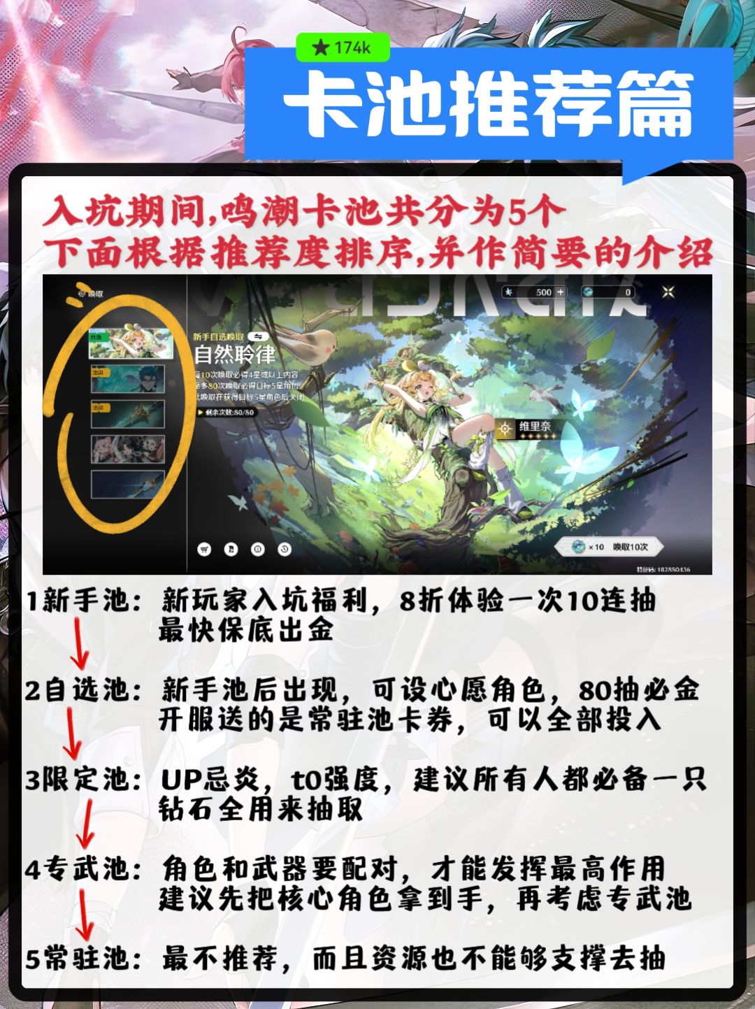 抽卡 新手池用开服送的福利抽出「维里奈」,出货之后限定「忌炎」池子,看自己需求抽不抽,想开荒战斗爽可抽,想组建雷队的玩家亦可攒着抽吟霖等.......或者直接XP抽卡 抽卡概率:5星大概1.8%,总结,概率不用管,出不出看脸,出来就是100%,没出就是0%,80/160大小保底,比较好的地方是武器池小保底必出。 开荒以及内测推荐配队 一个主C(主角或者安可或卡卡罗或凌阳),一个副C(鉴心,四星