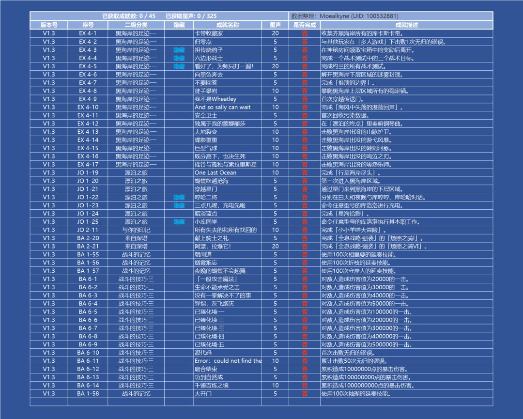 大家好呀,这里是moealkyne,本次给大家带来的是全成就便携查找数据表~ 您可以通过下方链接下载在线文档。 通过此数据表,可以更快的查询自己未完成的成就,并及时记录!可以多多使用哦~ 注意 1、相关复杂的操作流程已经在首图中展示出来,若您仍然无法理解,这里建议您重新学习一下Excel操作,评论区不受理技术层面问题。 2、本链接会随版本更新,为防止您的记录丢失,请及时保存副本。 3、如有成就层面