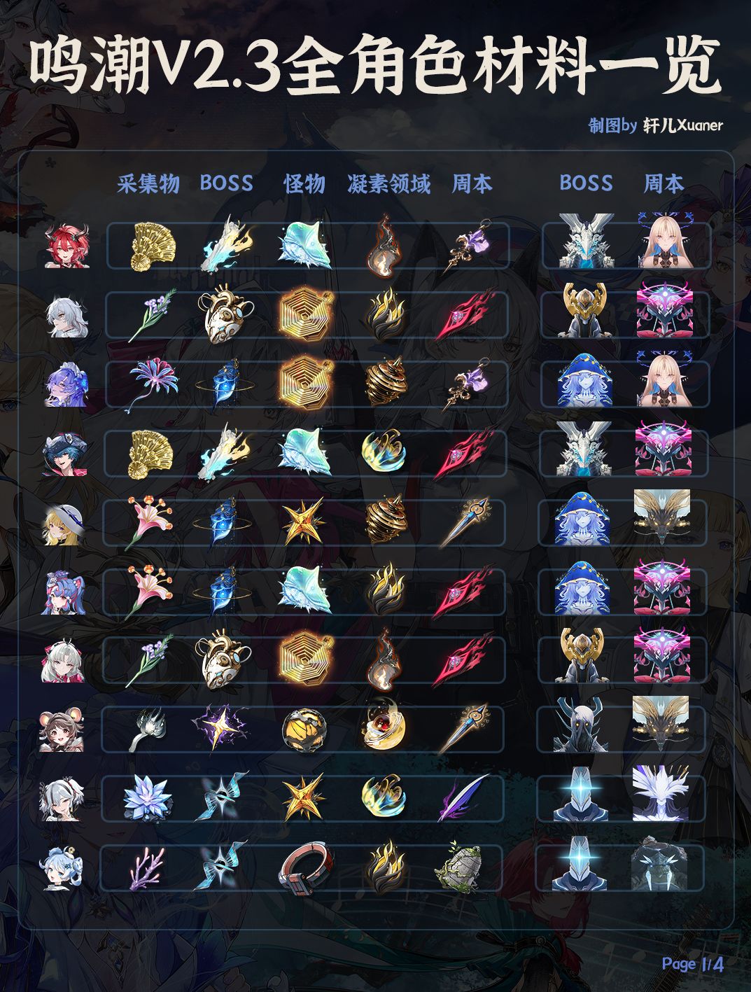 轩儿Xuaner给大家带来鸣潮一周年总结系列第一弹---鸣潮全角色武器材料一图流,方便各位漂泊者们在提前准备升级角色武器时,不必到处搜索。一键保存,方便查阅~ ----------------------------------------- 攻略食用指南 ① 截至目前,我们在鸣潮已经与31位共鸣者相遇,加上主角三种属性,共计34名角色 ② 新手可以多熟悉熟悉角色头像和常用材料,也方便快速上手鸣潮
