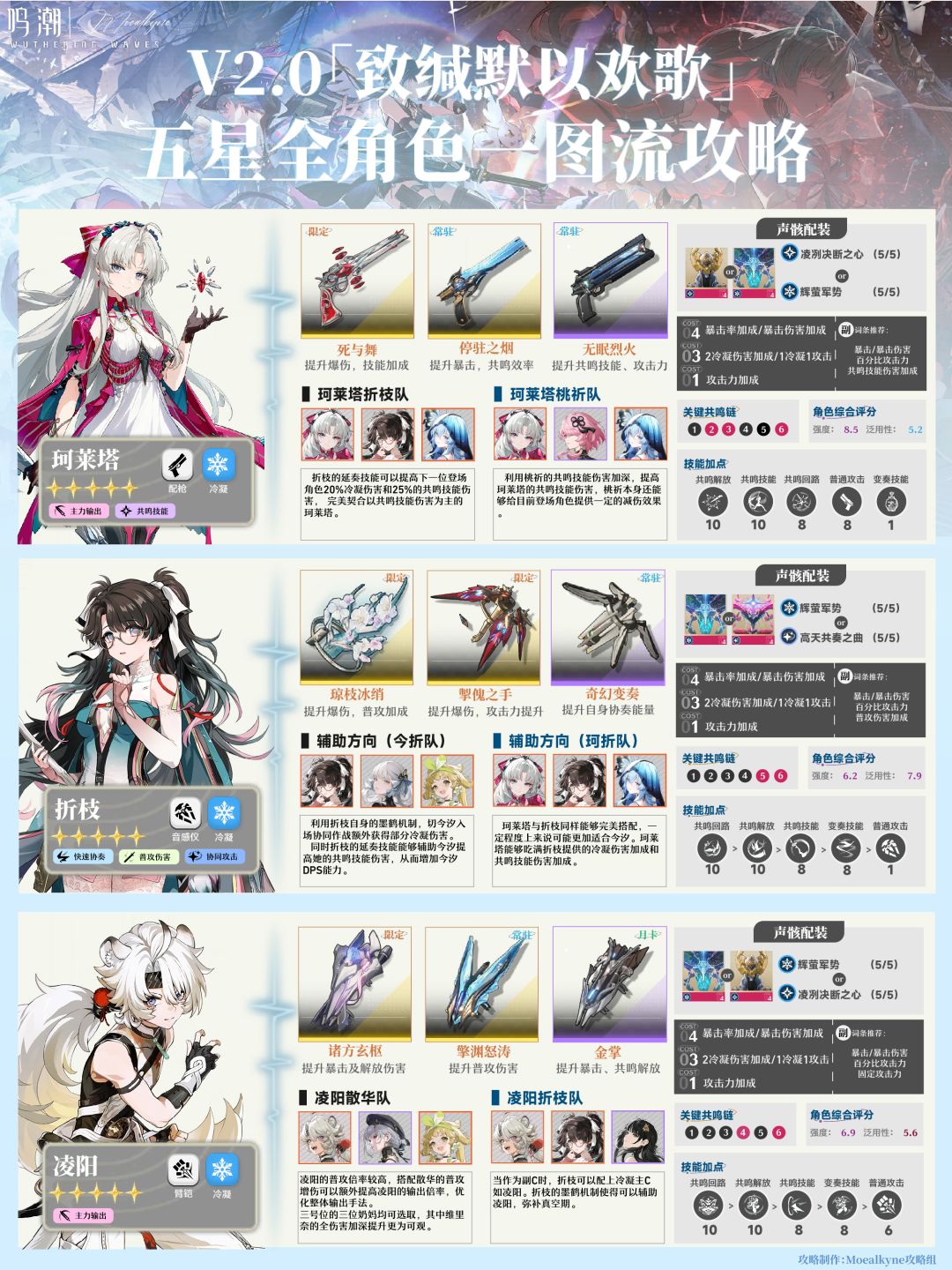 哦呀!这里是Moealkyne! 本期为大家带来的是【鸣潮】V2.0全五星角色简易一图流的养成攻略~ 【此简易一图流适用2.0正式服!相关数据已经过游戏内查询~】 【正式服UID:100532881】 本篇攻略将会按照技能优先级推荐、武器推荐、声骸推荐、共鸣链分析、配队建议等多个方面,分析目前全部五星角色的就业形势 「简易一图流」简易一图流(五星)将按照每个小版本进行更新,四星将会不定时更新,帮