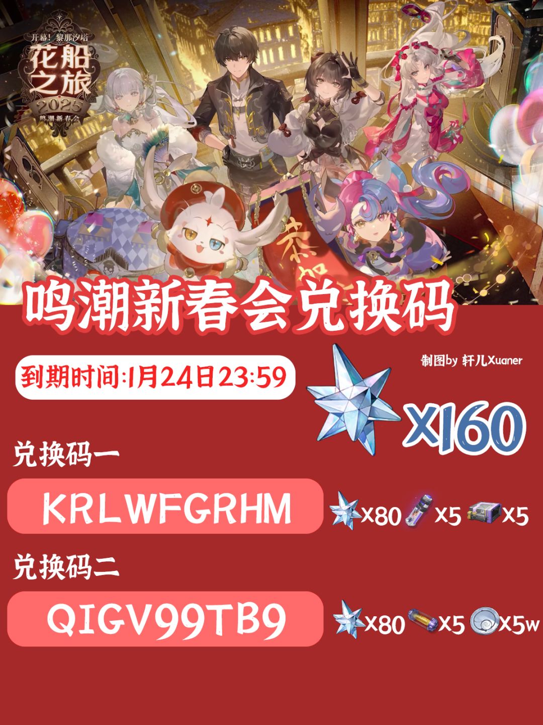 鸣潮新春会两个兑换码来啦,大家不要忘记领取~ 兑换码一:KRLWFGRHM 兑换码二:QIGV99TB9 新春会主要内容是各位二创UP主的剪辑作品播放以及配音老师们的新春祝福,没有游戏相关的新内容爆出~大家记得上游戏领取兑换码星声就好啦~ 大家可以互相奔走相告~后续鸣潮前瞻兑换码也会以这种图文形式在轩儿这里给大家发布哦~ 明天开始继续为各位潮友漂泊着们带来鸣潮的游戏攻略内容,敬请期待~预祝各位漂泊