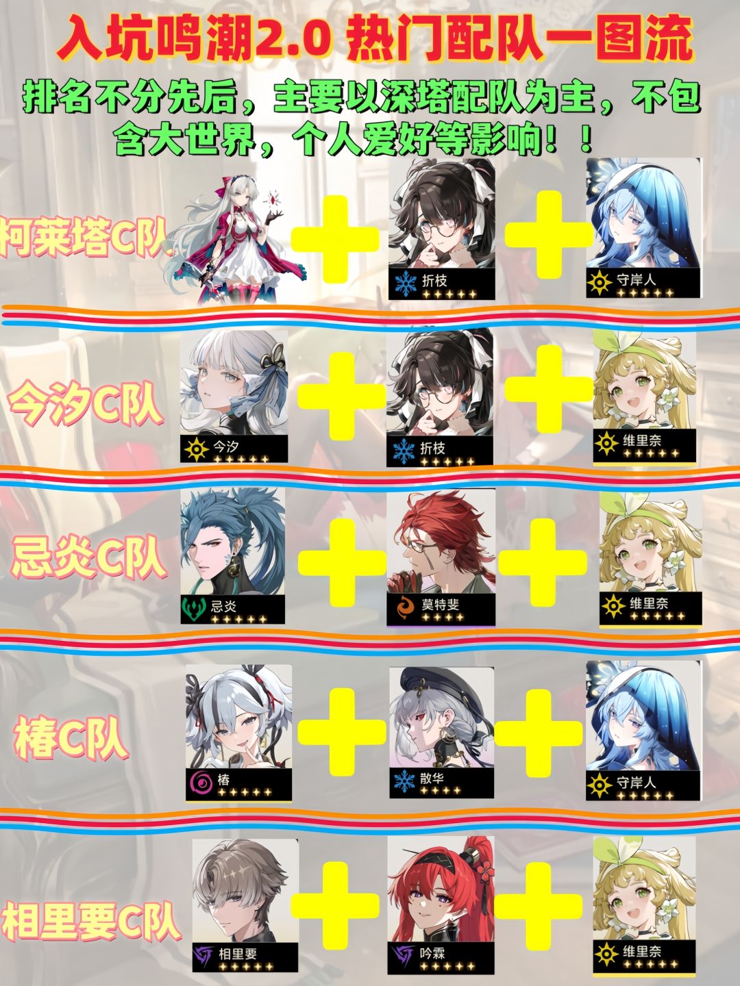 叠甲:配队是按照正常玩家进度和萌新走的,肯定有更强的,不含命座。 入坑鸣潮2.0热门配队一图流 排名不分先后,主要以深塔配队为主,不包含大世界,个人爱好等影响!! #鸣潮 #鸣潮攻略 #鸣潮配队 #鸣潮致缄默以欢歌
