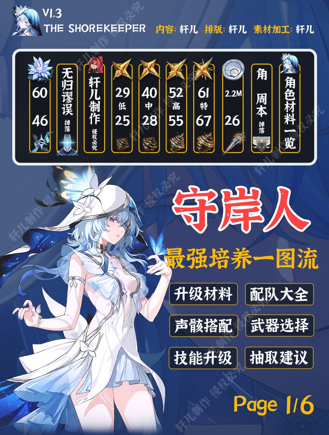 【此角色一图流适用1.3正式服!相关数据已经过游戏内查询~】 【正式服UID:100532881】 各位漂泊者早上中午晚上好呀,这里是熬夜速制的Moealkyne,各位久等啦!本次给大家带来的是「守岸人」角色一图流攻略~ 黑海岸守岸人,神秘清冷、超然物外。 她因你的唤醒而生,在漫长的守望中萌生出情感和渴望——守护与世界,与你之间的羁绊。 如非特殊声明,全系列长图采用署名-非商业性使用-禁止演绎 4