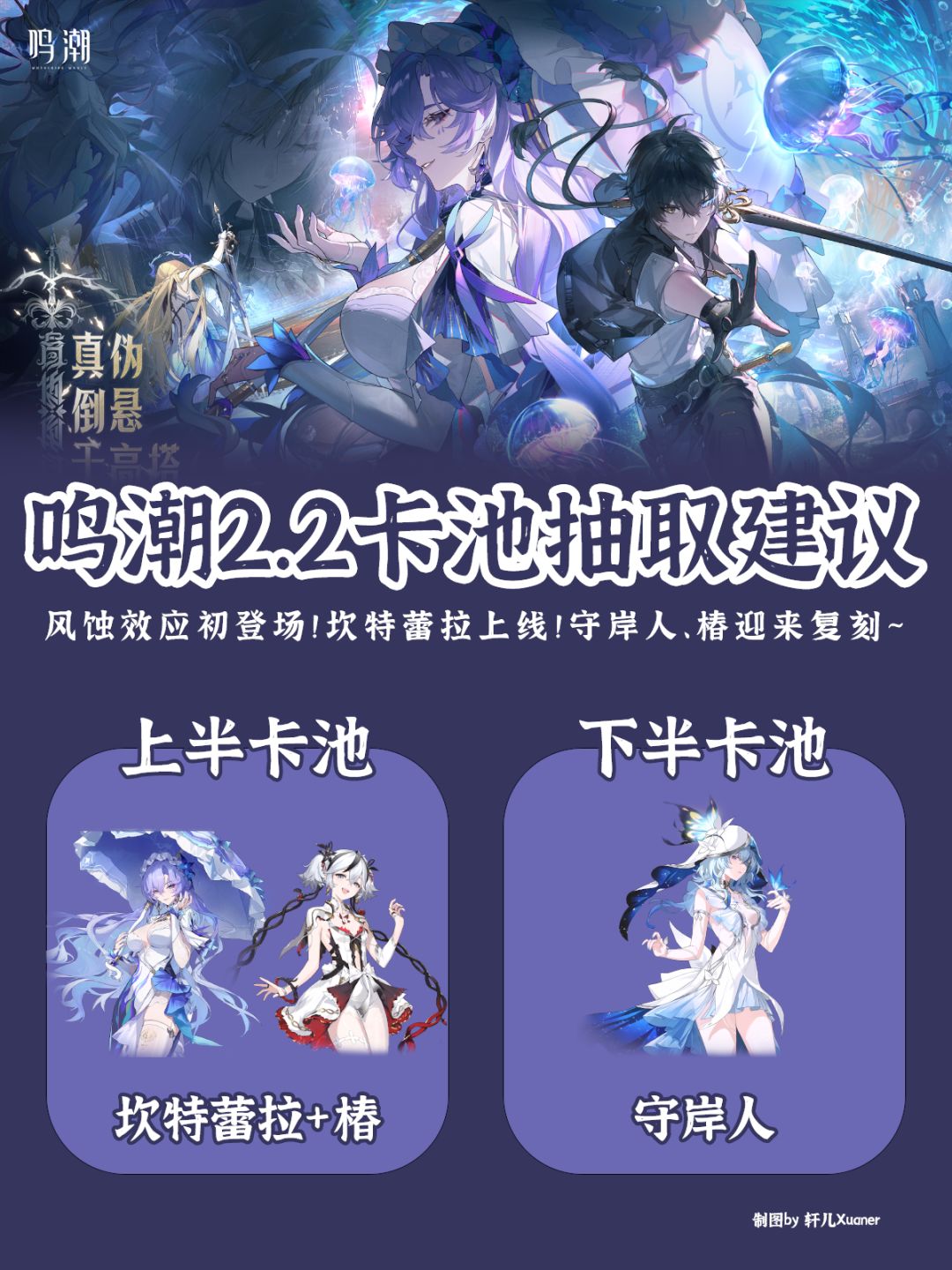 鸣潮2.2版本即将上线,轩儿Xuaner给各位老玩家或新玩家一些抽卡建议,仅供参考~ 上半卡池:坎特蕾拉+椿 下半卡池:守岸人 看个人卡池情况,无椿优先抽0+1椿,有椿后再考虑坎特蕾拉。椿目前两个深塔表现强劲,补到2或3链也不为过。坎特蕾拉与椿不适配,需要等后续湮灭主C,卡池充足可跳过,资源充足的话建议抽个0+1或0+0备用。坎特蕾拉XP党必抽。守岸人必抽!鸣潮目前毫无争议必抽角色,T0奶妈,抽个
