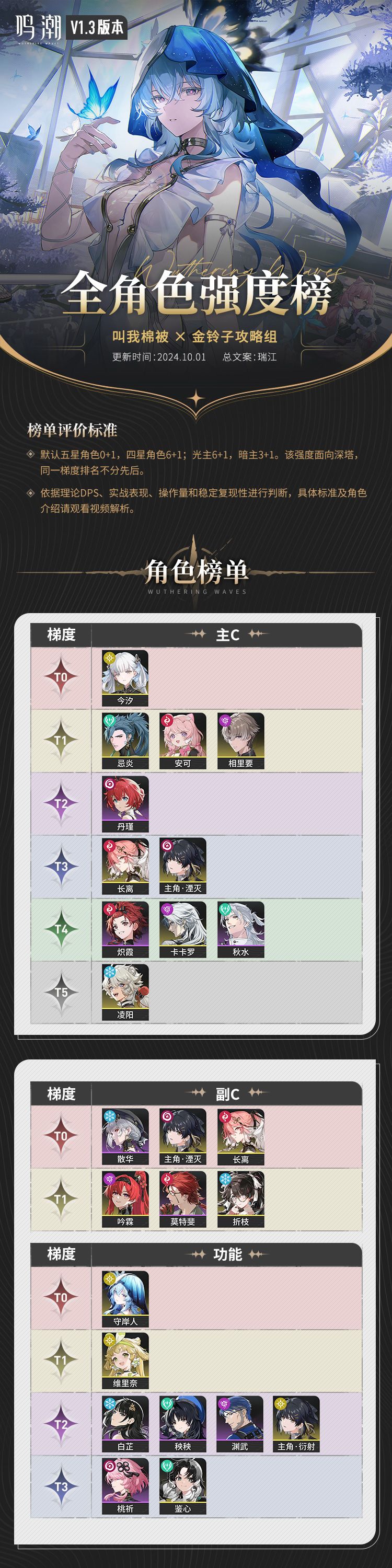 分享一下几位B站up主联合创作的榜单,不知道养什么角色的可以看看 【【鸣潮】现版本哪些角色最值得练?1.3版本最新全角色强度榜+全角色点评-哔哩哔哩】 https://b23.tv/POfbYQS