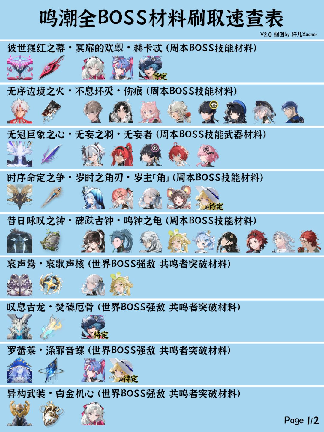 大家好,我是轩儿Xuaner!春节后上班第一天,各位潮友辛苦了。新的一周鸣潮的周本也刷新了,那么这周应该刷什么呢,相信大家每周体力溢出时都有这样的困惑,要在角色列表里翻来翻去不是很方便,轩儿这就为大家整理了目前为止所有角色的BOSS材料速查表,供大家使用~(ps.菲比和布兰特材料仅为猜测,具体内容以官方发布信息为主)。有意培养哪个角色,大家可以对照表格准备起来了,每位新角色轩儿也会及时为大家整理更
