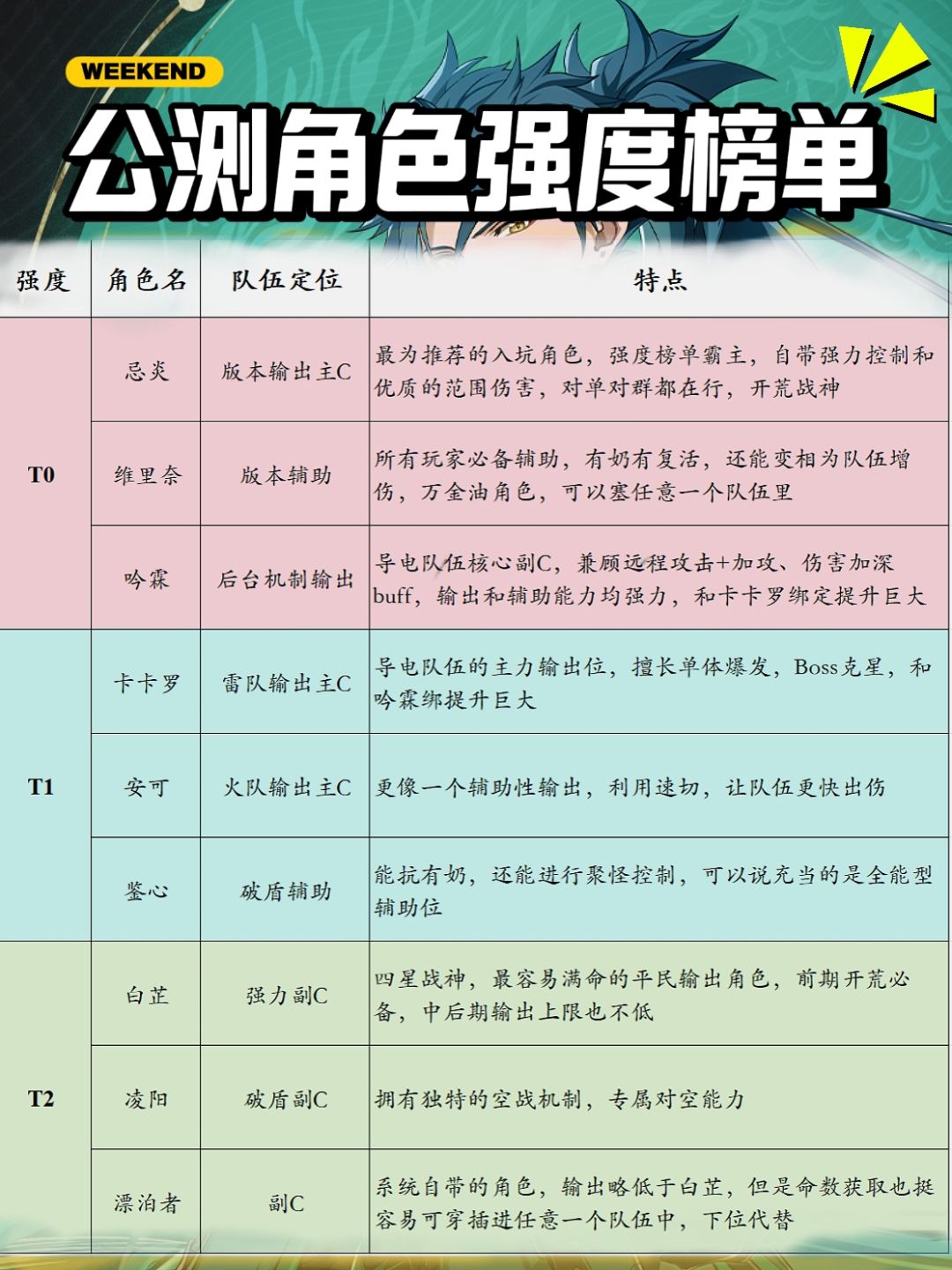 宝子们,鸣潮公测强度榜单来啦,共分为T0、T1、T2三个维度,既代表角色强度的同时,也代表了推荐度,大家根据图表描述和个人喜爱,酌情去抽取 ✨点赞+收藏,后续不迷路 这里提几点关于角色的小建议: 🔸不是一定要有T0角色才能玩,就算是T1、T2,甚至排不上榜单的四星角色均有一战之力,只不过打怪的难度会更高一些,体验感略微下降 🔸上述特点里描述的主C位至关重要,与阵容体系的完美成型息息相关,配对时要先