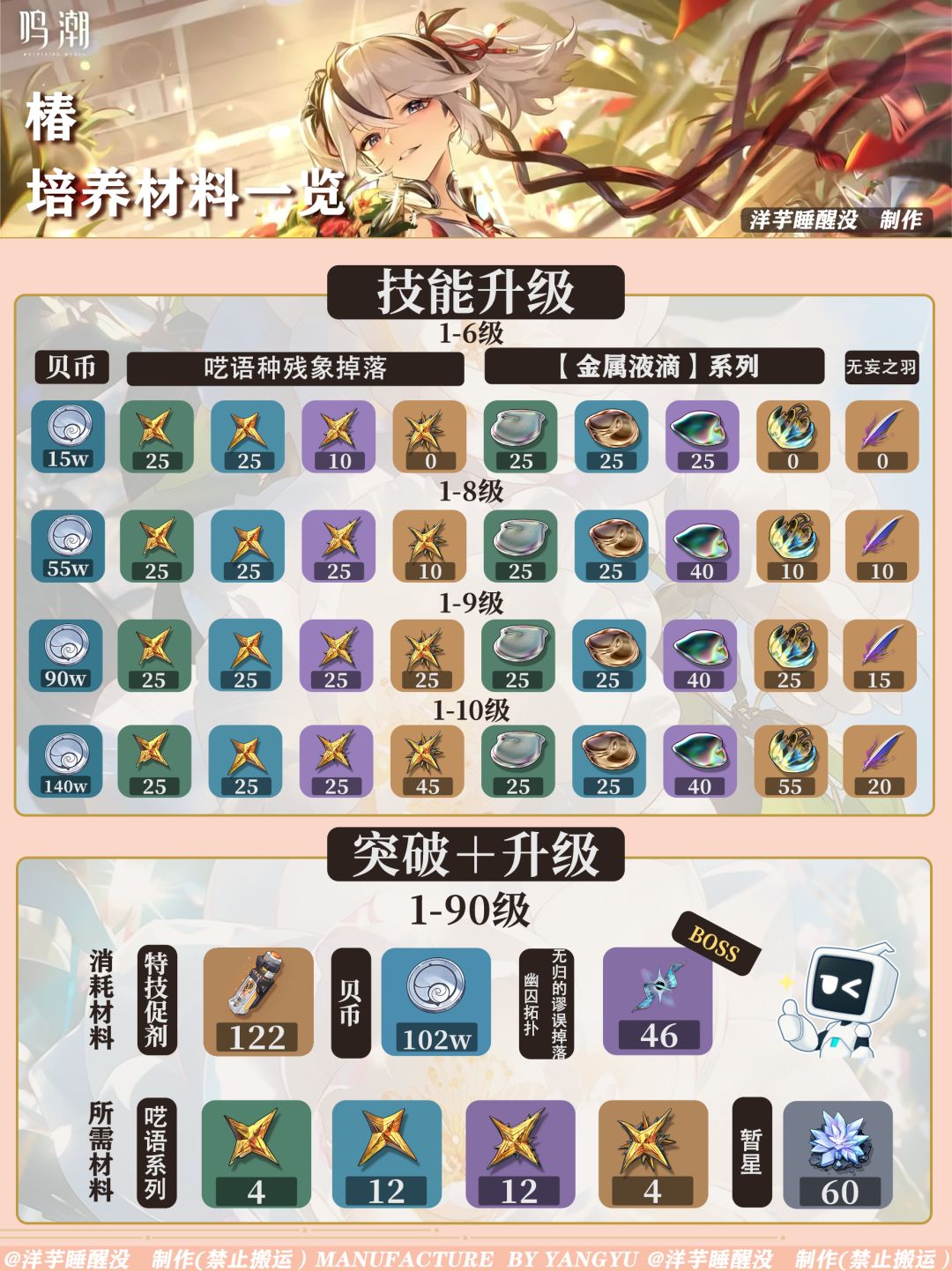 各位指挥官,开拓者,旅行者,漂泊者,绳匠,组长,舰长,导演们,大家好啊。我是小编,洋芋。 椿即将复刻!椿培养材料先行大礼包了解一下,一图流包含椿技能突破材料一览、椿等级消耗材料一览、椿等级突破材料一览!希望各位能够喜欢! #鸣潮 #游戏种草计划 #鸣潮创作激励 #鸣潮椿