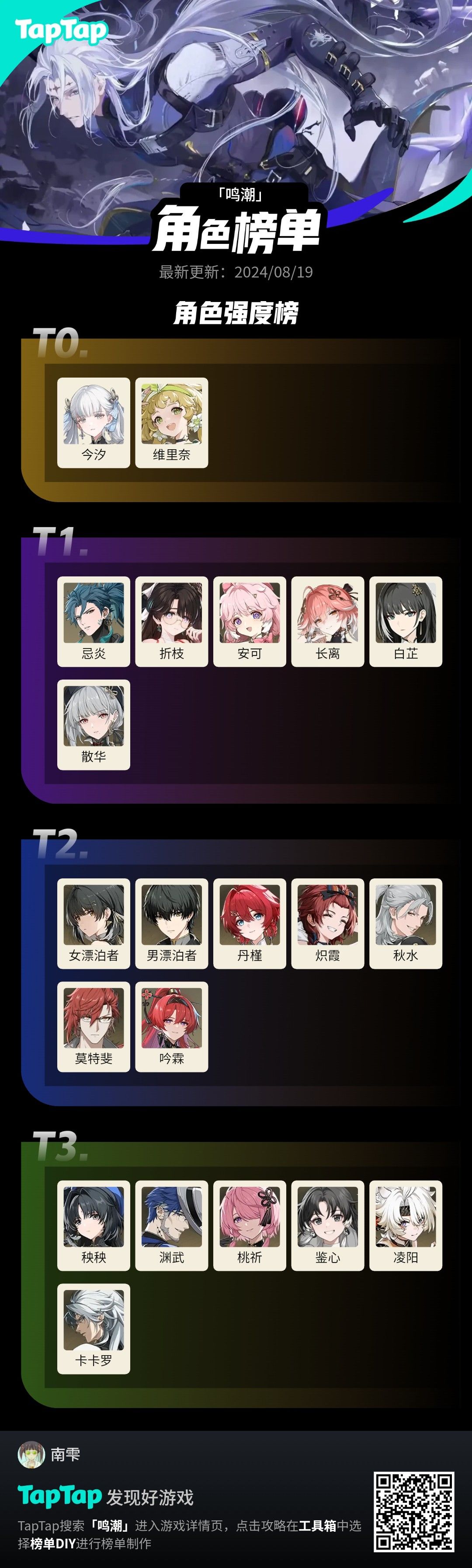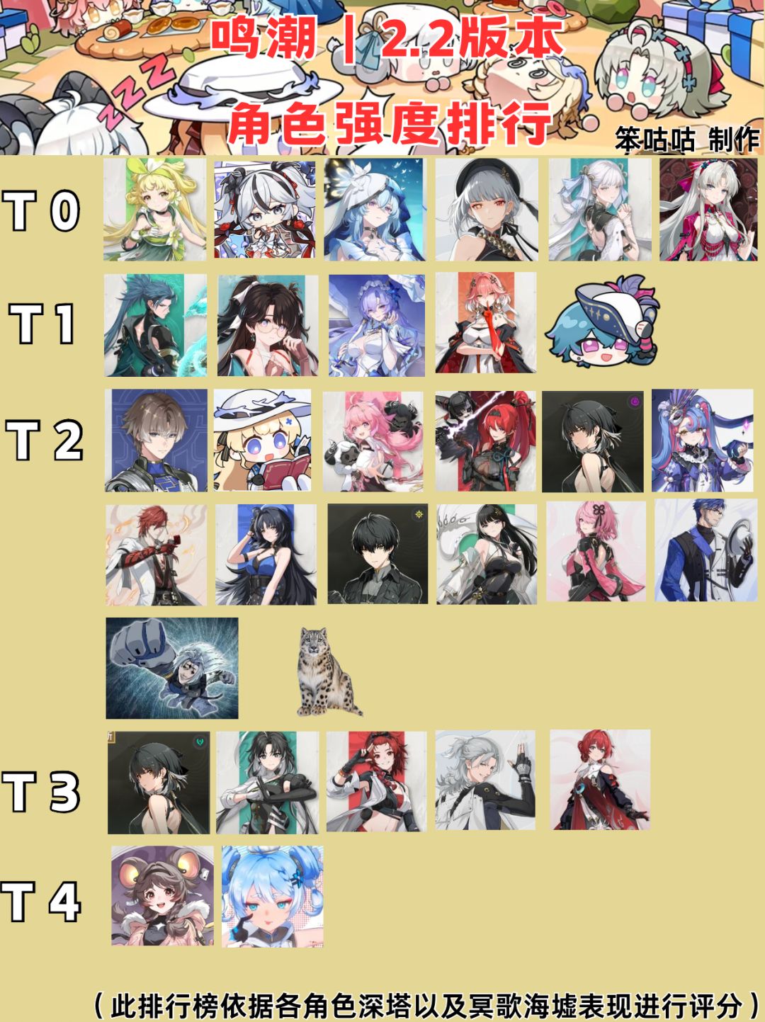 大家好,我是轩儿Xuaner,鸣潮V2.2上半最新全角色排行榜出炉~ 本次更新内容: 1、由于没有新角色加入,本期排行榜较上期变化不大 2、关于上期出来很多人讨论椿和菲比的位置是不是反了,这里说一下本份榜单使用0链角色,武器使用除了专武以外最适合的武器。如果椿是2-3链有专武,那肯定是T0。在0链基础对比上,菲比打老深塔BOSS表现会好一些。椿在新塔冥歌海墟绝对对群T0。所以再次强调下根据个人角色