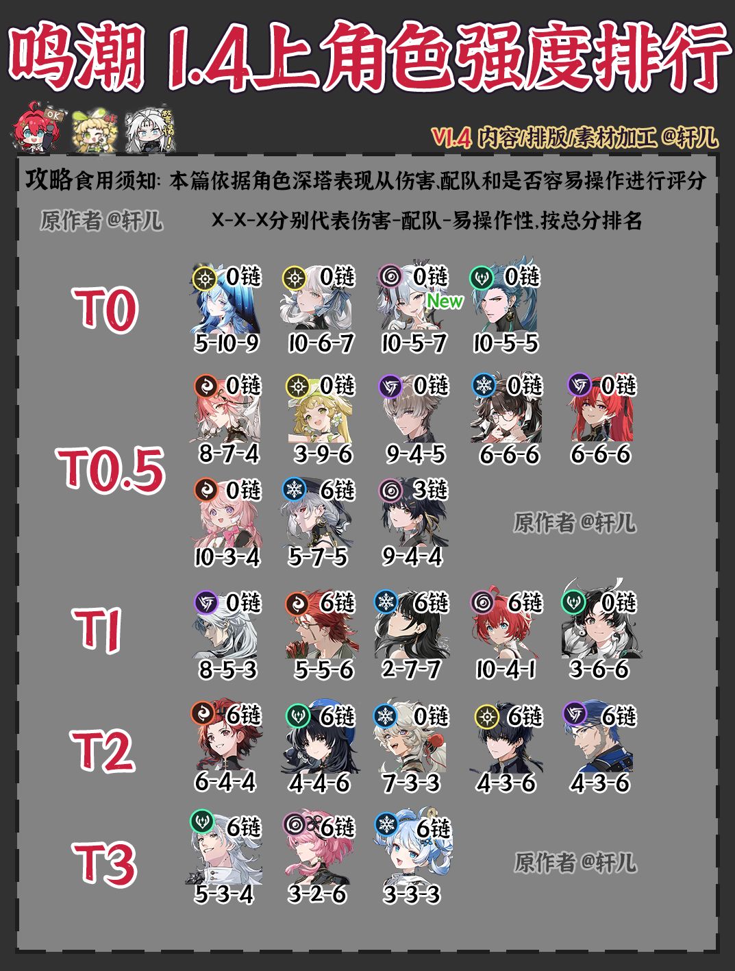 本次鸣潮角色强度排行榜新增椿,椿作为新的湮灭主C,其制造伤害能力非常可观,0链就已经起飞,2链6链伤害进一步爆炸 本次强度打分均以角色在逆境深塔表现为主进行客观评价,X-X-X分别代表伤害-配队-易操作性,按总分排名,T0(≥20分),T0.5(17-19分),T1(15-16分),T2(13-14分),T3(≤12分) 椿的评价: 伤害10分:椿的输出毋庸置疑,伤害属于T0,当前版本建议主C选择