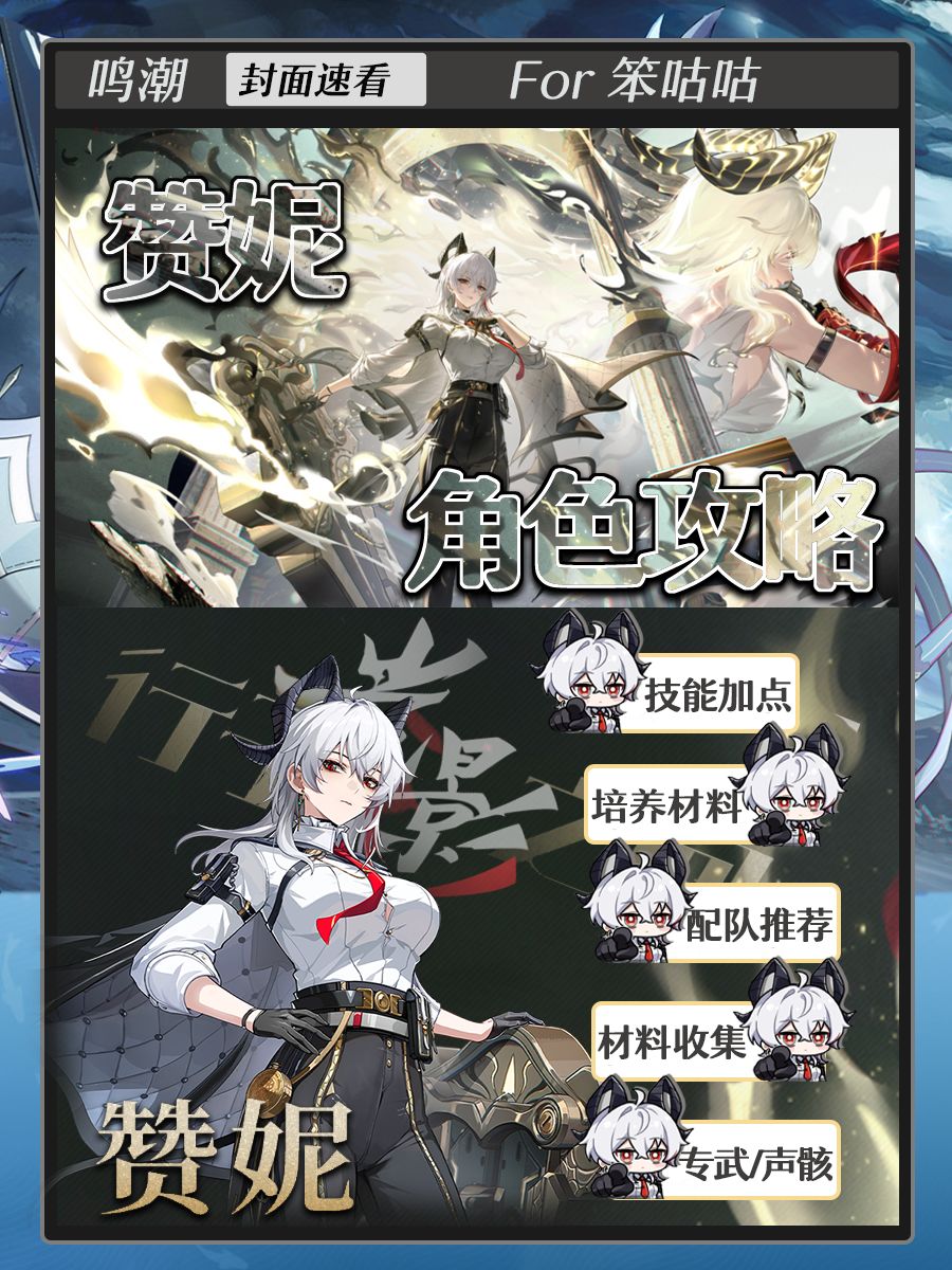 #鸣潮 #鸣潮攻略 #鸣潮创作激励 #鸣潮赞妮 #鸣潮黎那汐塔 笨咕咕来也! 新版本开启,新角色“赞妮”也如期上线,那本期内容带来的是2.3版本新角色“赞妮”的培养攻略~ 内含专武/声骸/配队等内容~ 观看的小伙伴觉得不错的话一点要给个大大的赞噢! (内容制作数据相关参考鸣潮wiki,有错误引导,欢迎大家指教批评,笨某一定虚心接受!!) ------グッ!(๑•̀ㅂ•́)و✧------- 觉