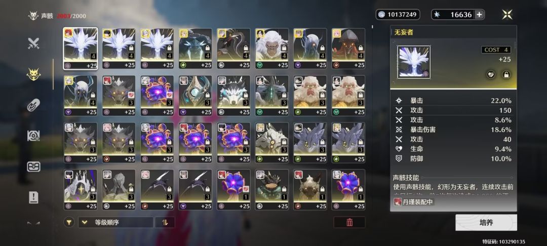 声骸背包谁都会满 先说说合成 把紫色全部干掉 换成金 之后去看3的属性 锁我们急需的属性咧如暗主 只保留湮灭。 攻击 共鸣 一样留2-3就行 忌炎就留气动加成 攻击和共鸣留2-3就行 看自己辅助需求 为什么不说4太少 没必要老清理 在说1 全锁攻击 防御生命 自己锁俩套左右就行 我锁的过多合成过程就不全展示了 3天合一次 一次半小时 (辅助奶妈等 自己研究需要的锁吧 目前阶段不常用)