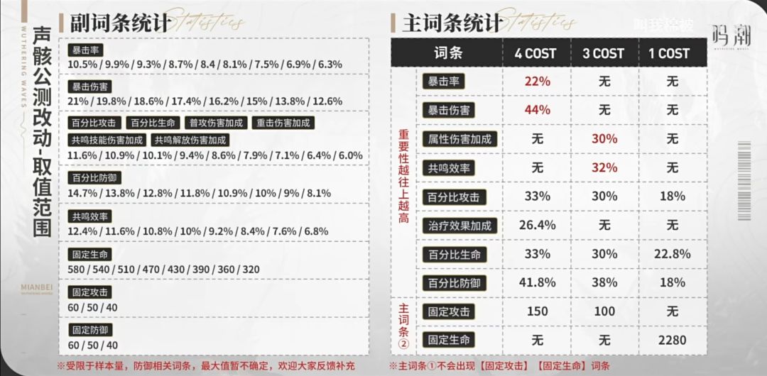 声骸分为3个费用 cost 1.3.4 角色可以装备五个声骸,但费用总和最多为12,所以声骸搭配一般为43311或者44111 每个声骸有不同的属性,2和5个相同的属性会激活属性的套装效果 每个金色声骸有两个主词条,下面为固定的词条,上面为随机的词条,5个副词条槽位,每升5级可以消耗调谐器解锁一个随机副词条 副词条有: 百分比的攻击 生命 防御 暴击率 暴击伤害 共鸣效率 共鸣技能伤害 共鸣解放