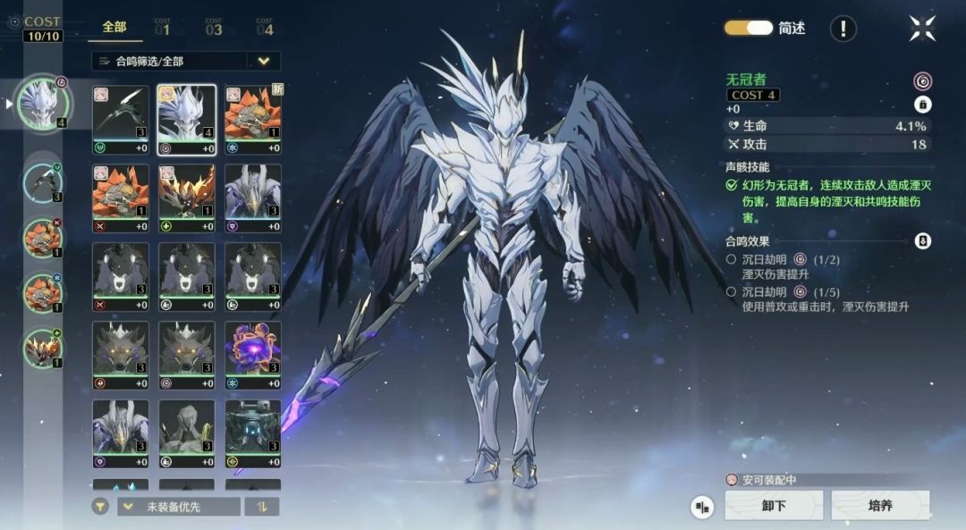 前期养奶妈和副C的性价比不高,先练一个主C之后考虑拉一下,前期不要拉奶妈声骸,收益极低。副c词条要求不高,主词条对,副词条能用就行。 副C声骸推荐 吟霖:1、主声骸推荐带无常凶鹭cost4(带轻云出月套装的优点是有充能,给队友上攻击buff,吟霖的倍率很高,为什么不带双属伤?带双导电属性而牺牲充能速度,导致卡卡罗启动速度变慢,以至于爆发轴在整体循环轴中缩短,伤害肯定缺失) 过渡可选择44111、毕