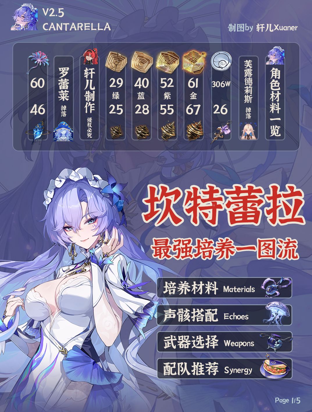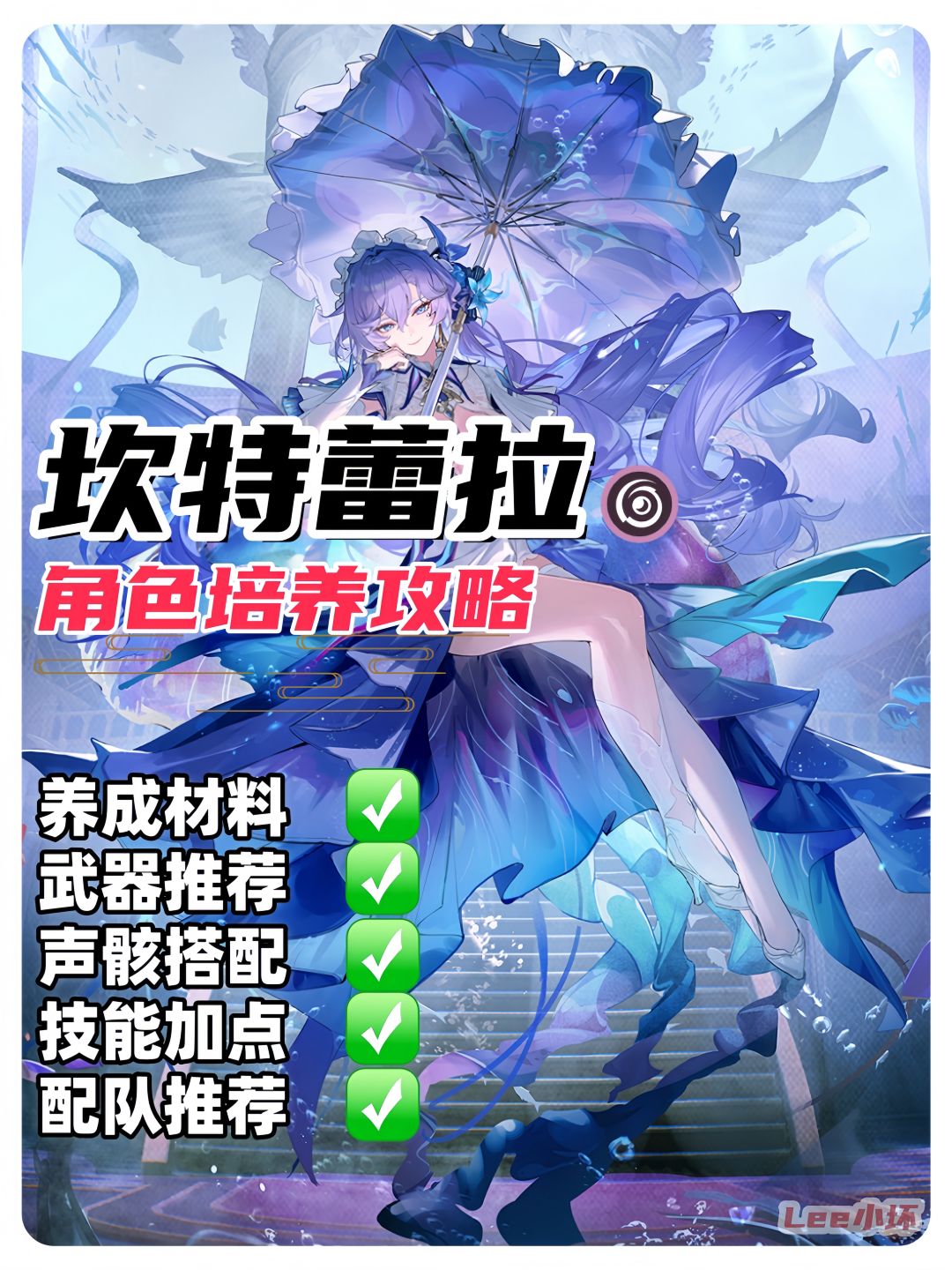 哦呀!这里是Moealkyne! 本期为大家带来的是【鸣潮】V2.2限定角色坎特蕾拉的养成攻略~ 【此角色一图流适用2.2正式服!相关数据已经过游戏内查询~】 【正式服UID:100532881】 本篇攻略将会按照培养素材需求、技能优先级推荐、武器推荐、声骸推荐、共鸣链分析、配队建议等多个方面,详细剖析该角色的方方面面! 「模板更新」 从2.0版本开始,我们将采用全新的模板制作角色一图流