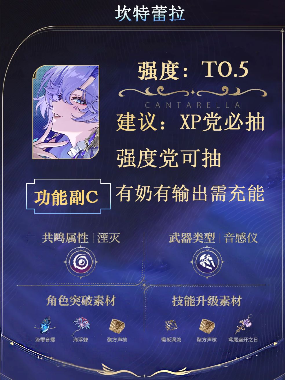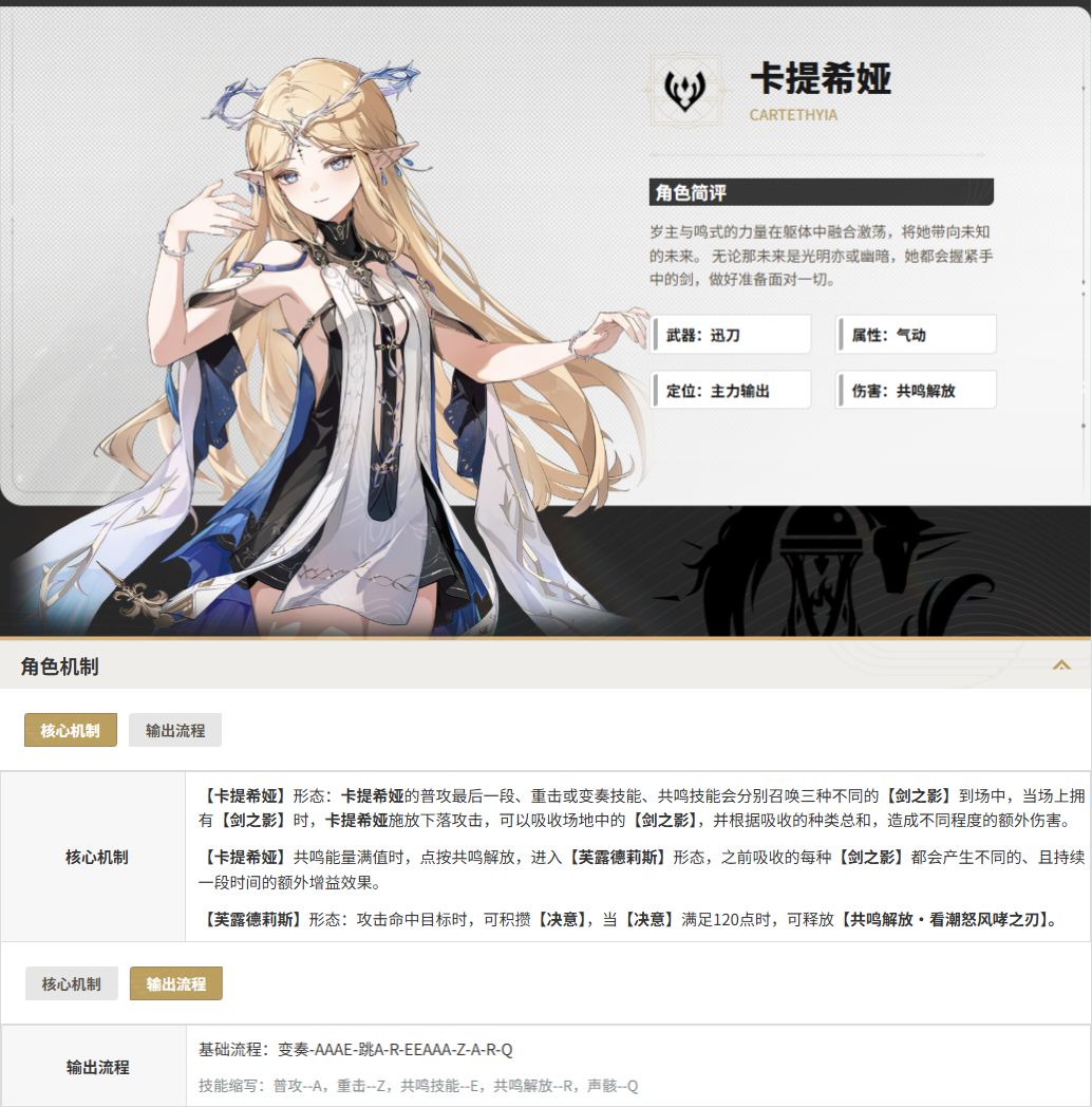 先说结论: 坎特蕾拉作为协同攻击型副C/速切C,资源有限的情况下,请优先考虑已有角色(今汐,珂莱塔,守岸人,洛可可)和未来期望(赞妮/卡提希娅/鲁帕/夏空) 一、角色定位与核心机制 角色定位 三定位三开花角色,类似船长既有奶又有输出,但具体使用时还有有差异。 副C/速切C:在作为副c/摔炮时,要有一定的输出就是穿新暗套+专武,才能有比较可观的输出。 充能工具人:这定位更偏向没有折枝时的今汐,穿轻云